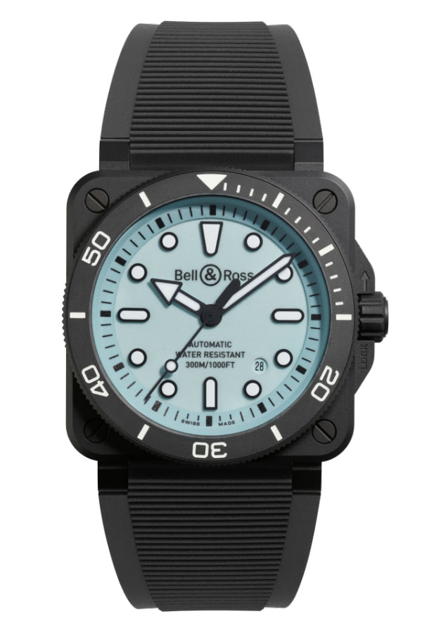 luxusní hodinky Bell & Ross BR 03 DIVER Full Lum Ceramic Manufaktúrni kalibr, Voděodolnost 200M, 42 mm. Hodinky disponují funkcemi luminiscence a ukazatel data. Základní parametry hodinek jsou: barva číselníku je modrá, typ strojku je mechanické hodinky s automatickým nátahem, materiál řemínku je kaučuk a vodotěsnost je 200 m.