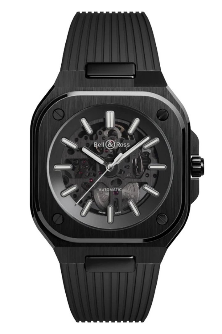 luxusní hodinky Bell & Ross BR 05 AUTO SKELETON BLACK CERAMIC Keramika, 41 mm. Hodinky disponují funkcemi luminiscence. Základní parametry hodinek jsou: barva číselníku je černá a průhledná, typ strojku je mechanické hodinky s automatickým nátahem, vodotěsnost je 100 m a materiál řemínku je kaučuk.