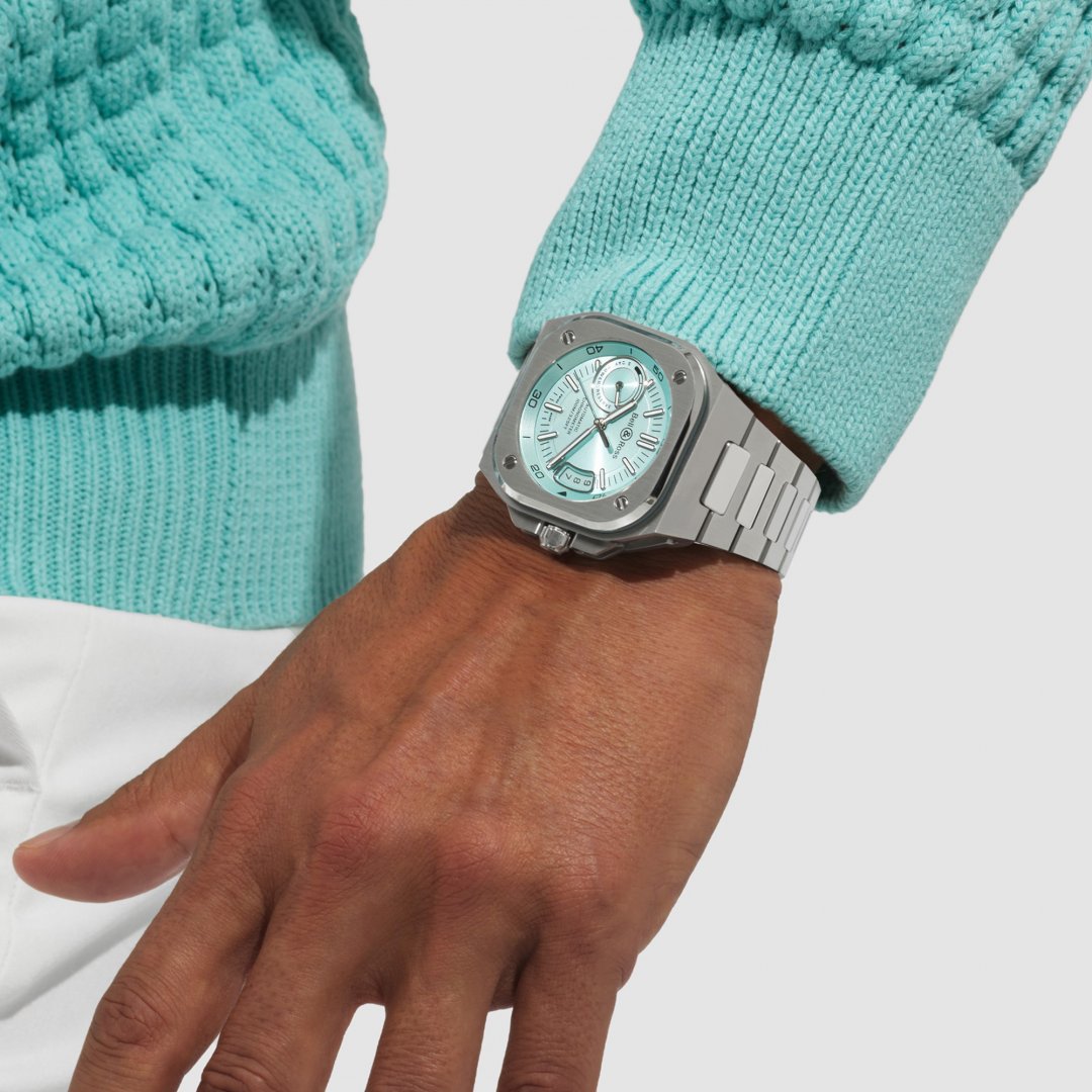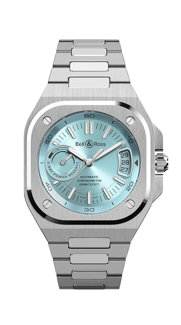 luxusní hodinky Bell & Ross BR 05 AUTO ICE BLUE STEEL Manufaktúrni kalibr, 41 mm. Hodinky disponují funkcemi ukazatel data, luminiscence a rezerva chodu. Základní parametry hodinek jsou: vodotěsnost je 100 m, typ strojku je mechanické hodinky s automatickým nátahem, barva číselníku je modrá a materiál řemínku je ocel.