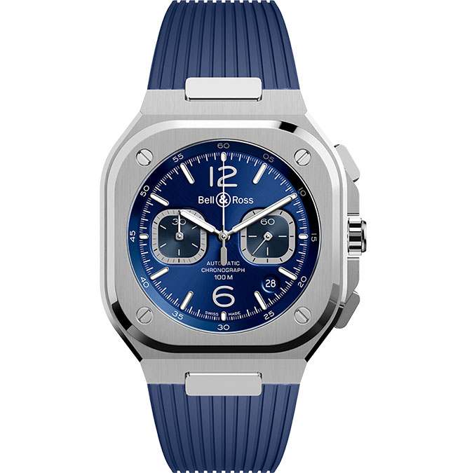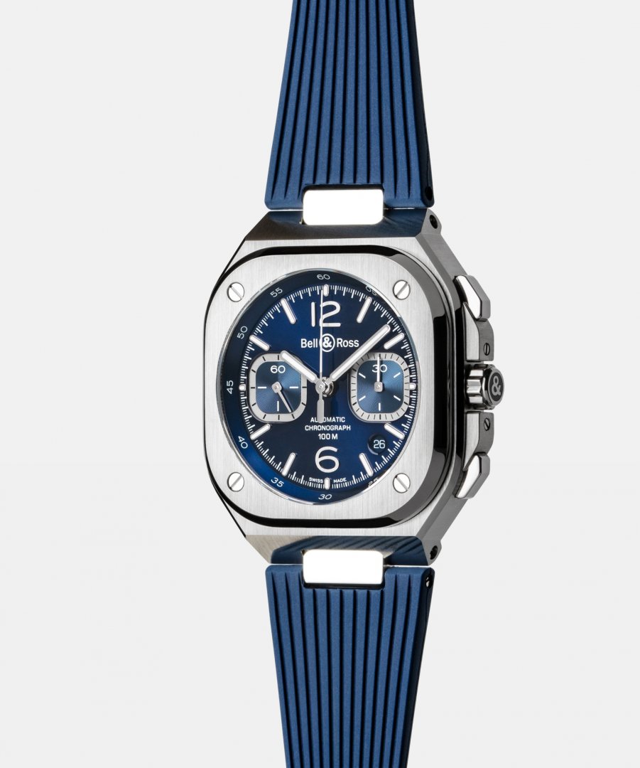 luxusní hodinky Bell & Ross BR 05 CHRONO Blue Steel Automat Chronograf, 42 mm. Hodinky disponují funkcemi luminiscence, stopky a ukazatel data. Základní parametry hodinek jsou: typ strojku je mechanický chronograf s automatickým nátahem, vodotěsnost je 100 m, barva číselníku je modrá a materiál řemínku je kaučuk.