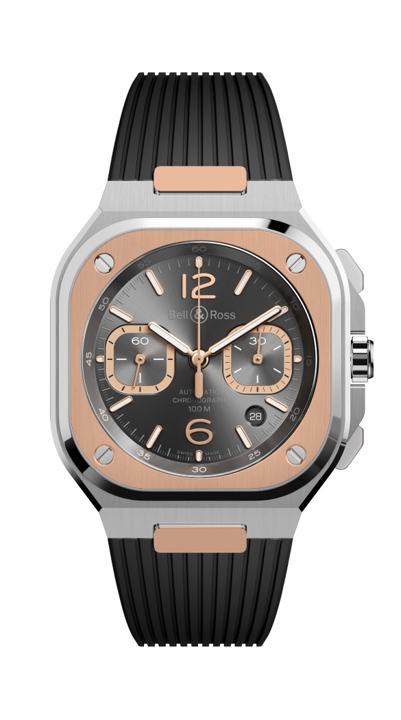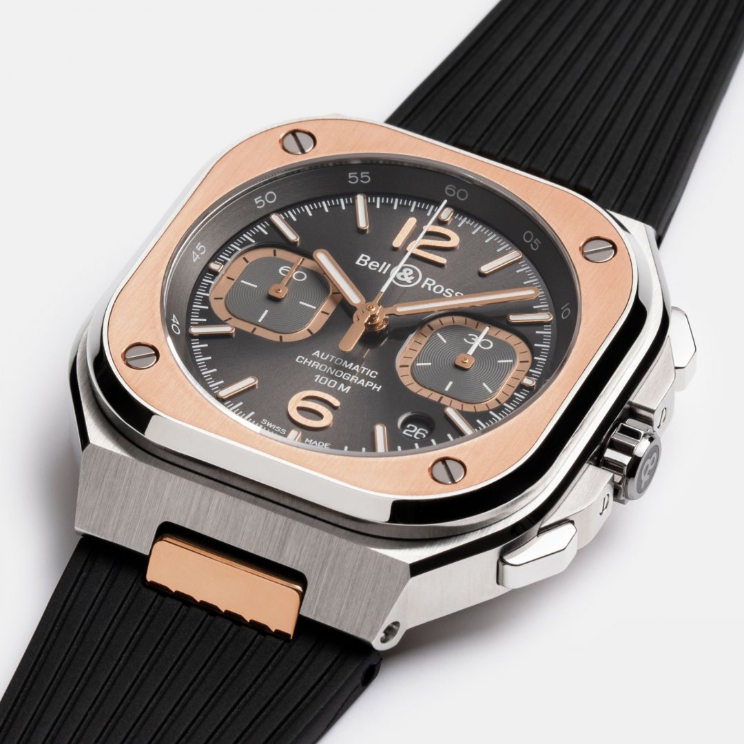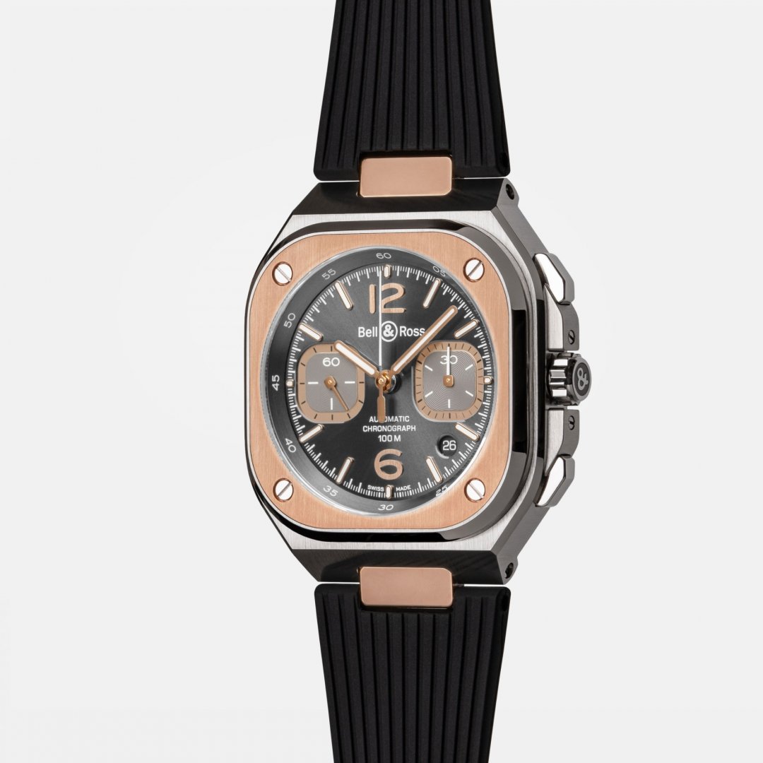 luxusní hodinky Bell & Ross BR 05 CHRONO Grey steel & Gold Automat Chronograf, 42 mm. Hodinky disponují funkcemi luminiscence, stopky a ukazatel data. Základní parametry hodinek jsou: typ strojku je mechanický chronograf s automatickým nátahem, vodotěsnost je 100 m, materiál řemínku je kaučuk a barva číselníku je šedá.