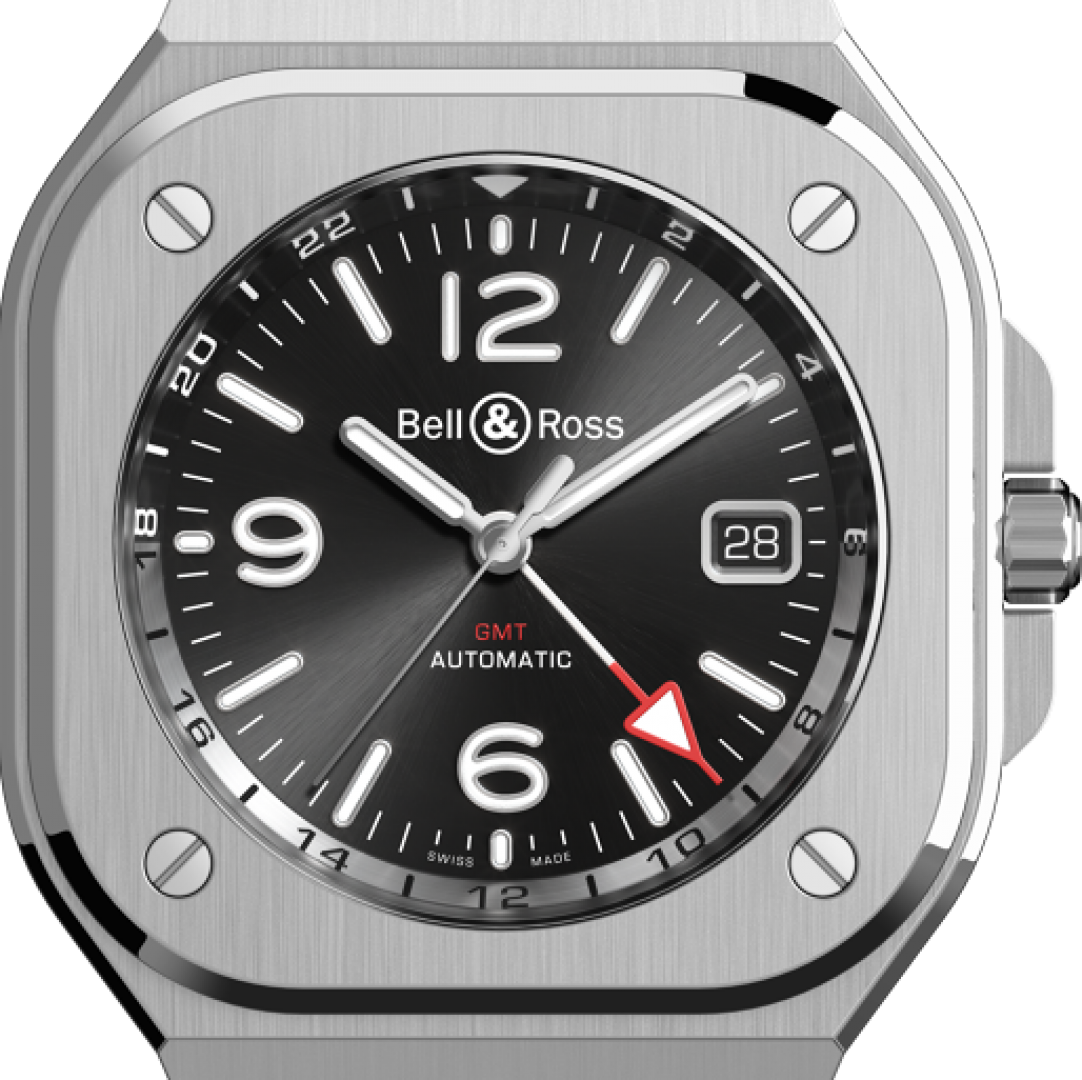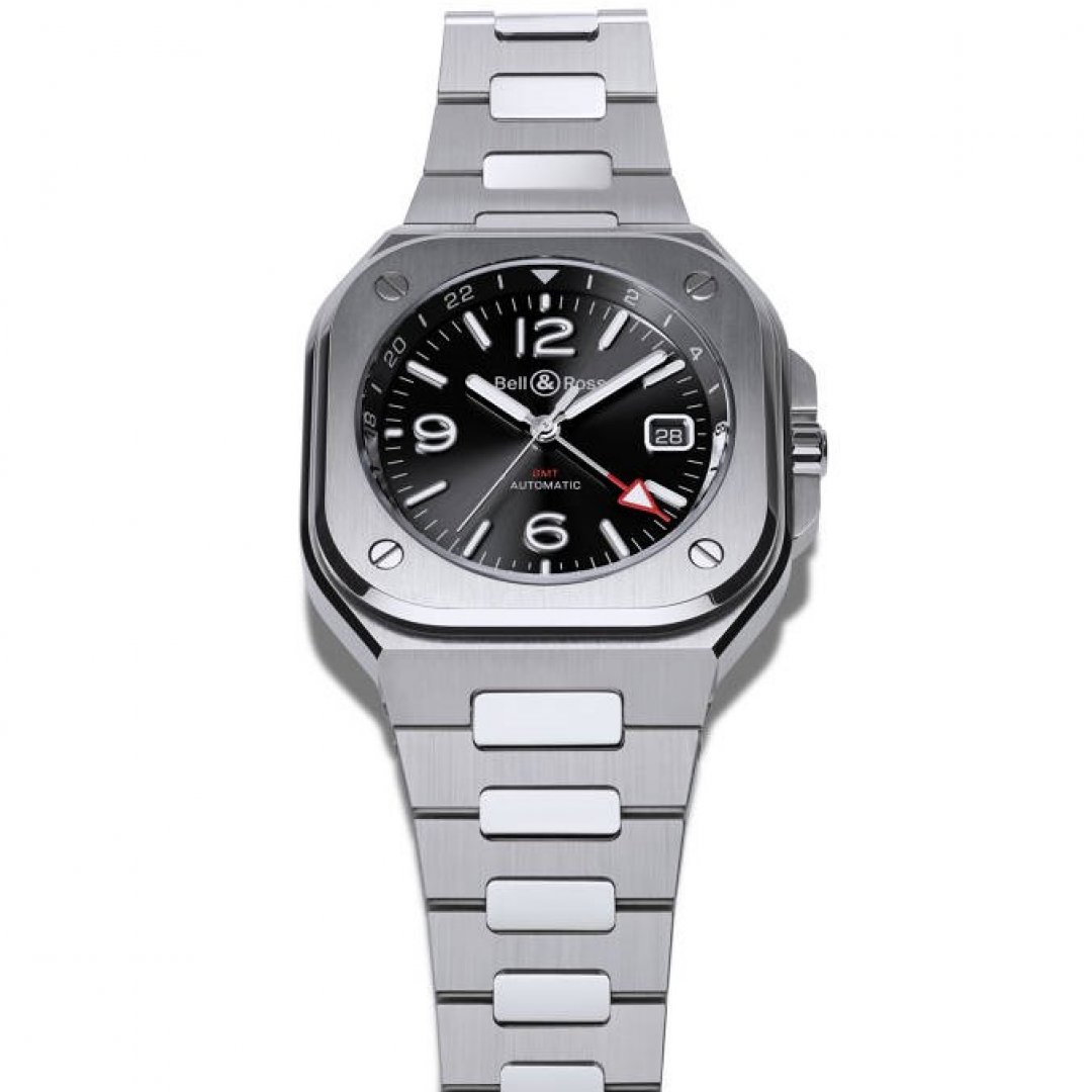luxusní hodinky Bell & Ross BR 05 GMT Ocel, 41 mm. Hodinky disponují funkcemi ukazatel data a duální čas. Základní parametry hodinek jsou: vodotěsnost je 100 m, barva číselníku je černá, materiál řemínku je ocel a typ strojku je mechanické hodinky s automatickým nátahem.