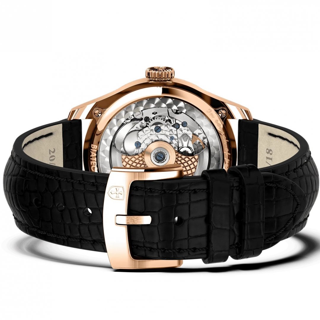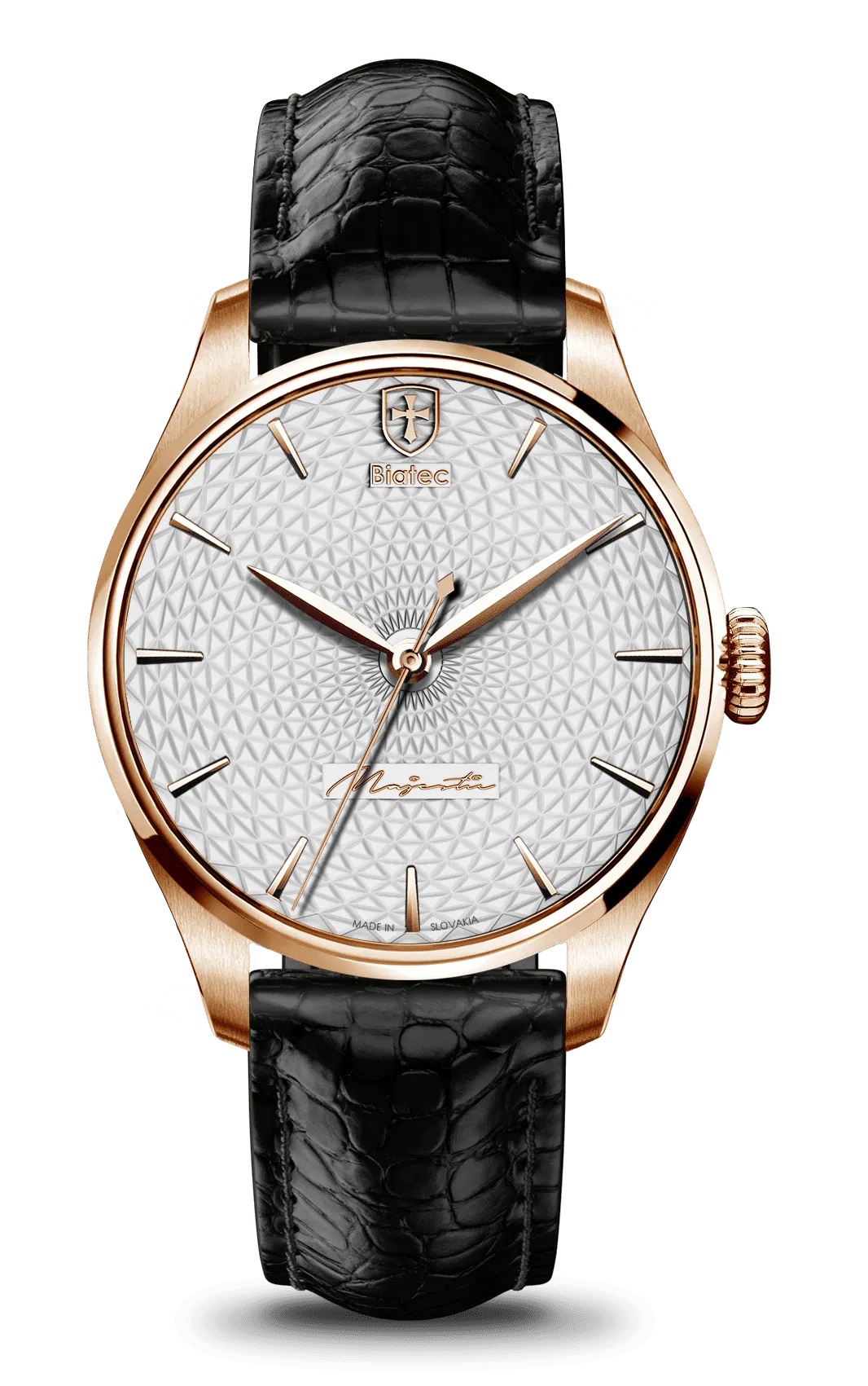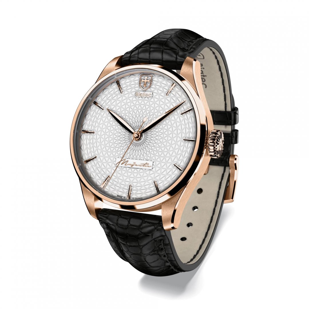 luxusní hodinky Biatec MAJESTIC Automat, 40 mm. Základní parametry hodinek jsou: typ strojku je mechanické hodinky s automatickým nátahem, materiál řemínku je kůže, vodotěsnost je 100 m a barva číselníku je stříbrná.