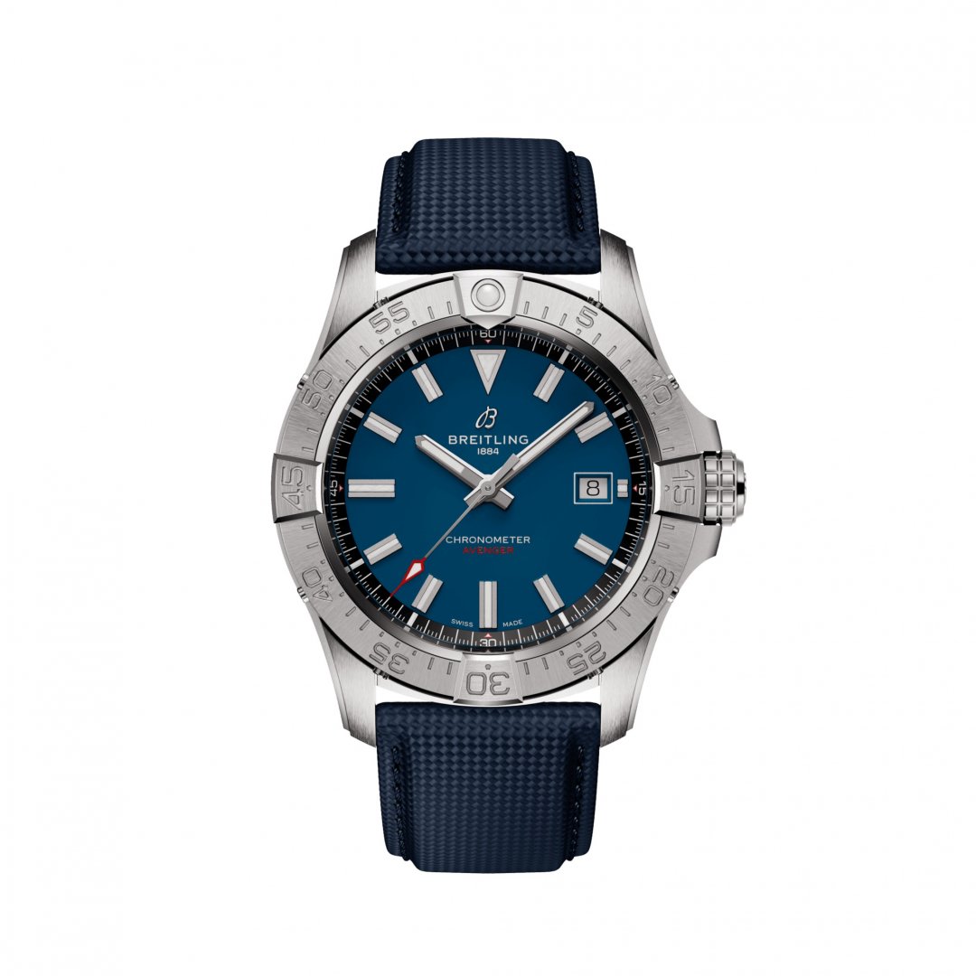 luxusní hodinky Breitling Avenger Automatic 42 Automat, Vodotěsnost 300M, 42 mm. Hodinky disponují funkcemi luminiscence a ukazatel data. Základní parametry hodinek jsou: vodotěsnost je 300 m, typ strojku je mechanické hodinky s automatickým nátahem, barva číselníku je modrá a materiál řemínku je kůže.