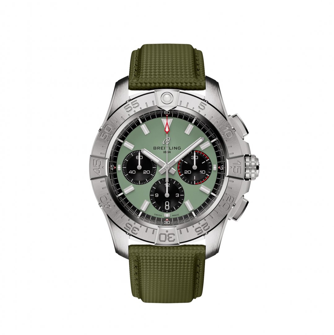 luxusní hodinky Breitling Avenger B01 Chronograph 44 Manufaktúrni kalibr, Voděodolnost 300M, 44 mm. Hodinky disponují funkcemi luminiscence, stopky a ukazatel data. Základní parametry hodinek jsou: typ strojku je mechanický chronograf s automatickým nátahem, vodotěsnost je 300 m, materiál řemínku je kůže a barva číselníku je zelená.