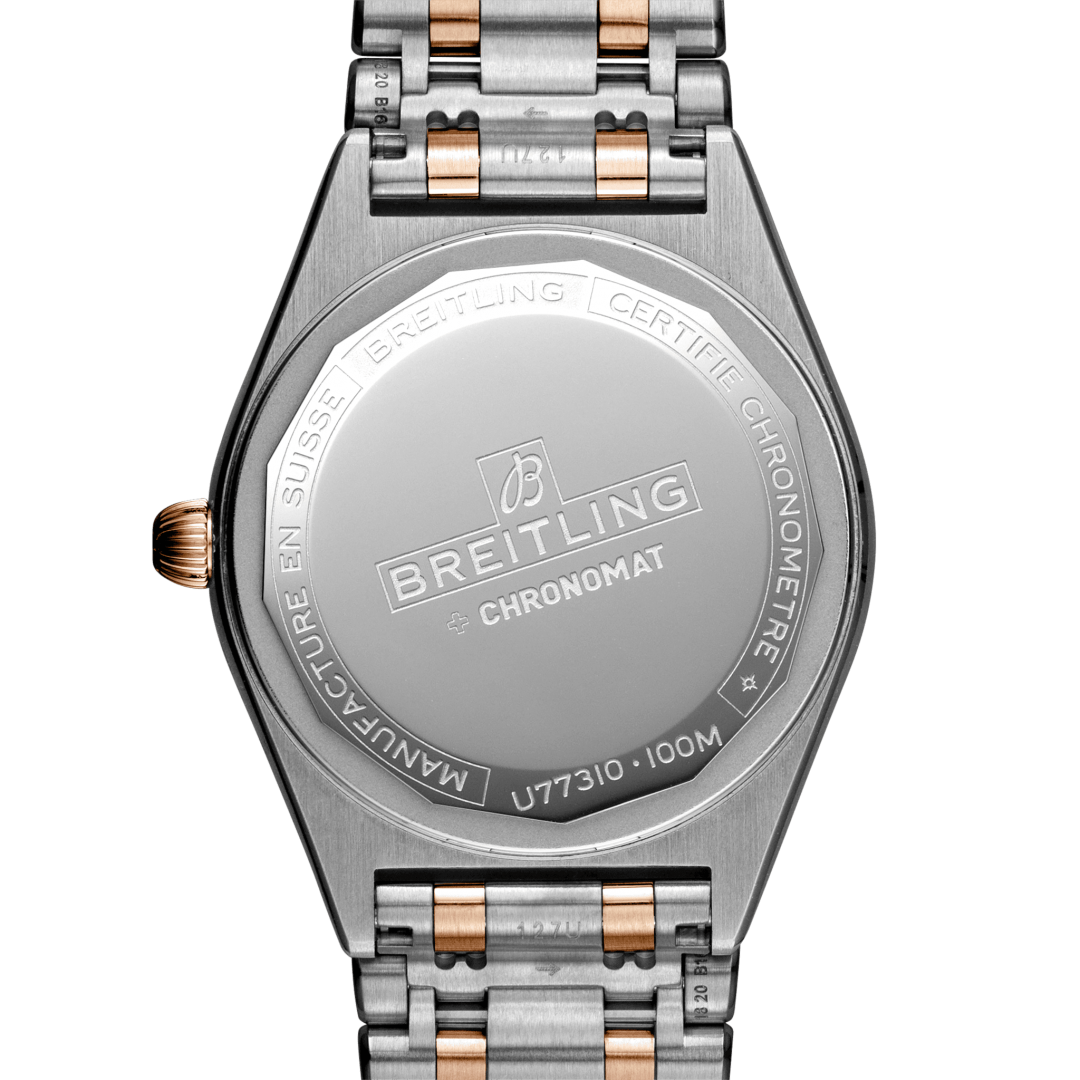 luxusní hodinky Breitling Chronomat 32 Zlato & Diamanty, Quartz, 32 mm. Hodinky disponují funkcemi luminiscence, ukazatel data a E.O.L.. Základní parametry hodinek jsou: materiál řemínku je ocel a zlato, vodotěsnost je 100 m, barva číselníku je perleť a typ strojku je Quartz hodinky.