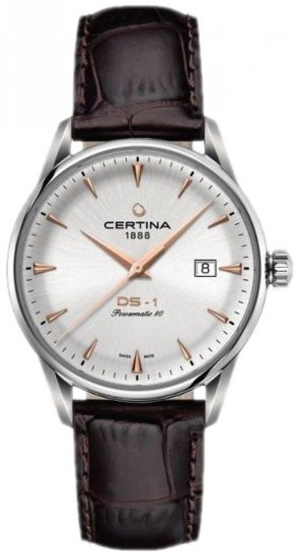 Luxusní hodinky Certina DS-1 Powermatic 80, 40 mm. Hodinky disponují funkcemi ukazatel data. Základní parametry hodinek jsou: typ strojku je mechanické hodinky s automatickým nátahem, vodotěsnost je 100 m, materiál řemínku je kůže a barva číselníku je stříbrná.