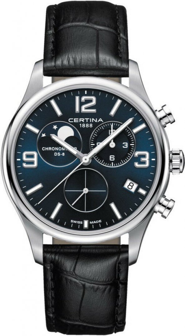 luxusní hodinky Certina DS-8 Měsíční fáze, Quartz Chronograf, 42 mm. Hodinky disponují funkcemi luminiscence, měsíční fáze, stopky, ukazatel data a E.O.L.. Základní parametry hodinek jsou: typ strojku je Quartz chronograf, vodotěsnost je 100 m, materiál řemínku je kůže a barva číselníku je modrá.