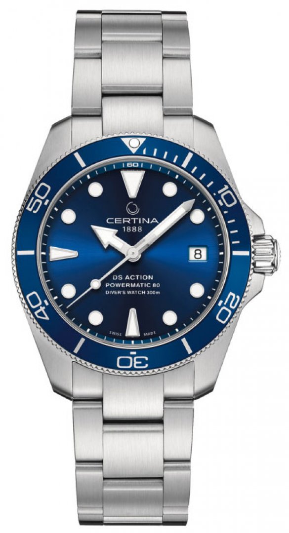 luxusní hodinky luxusní hodinky Certina DS Action Lady Powermatic 80, Voděodolnost 300M, 34.50mm. Hodinky disponují funkcemi luminiscence a ukazatel data. Základní parametry hodinek jsou: barva číselníku je modrá, typ strojku je mechanické hodinky s automatickým nátahem, materiál řemínku je ocel a vodotěsnost je 300 m.