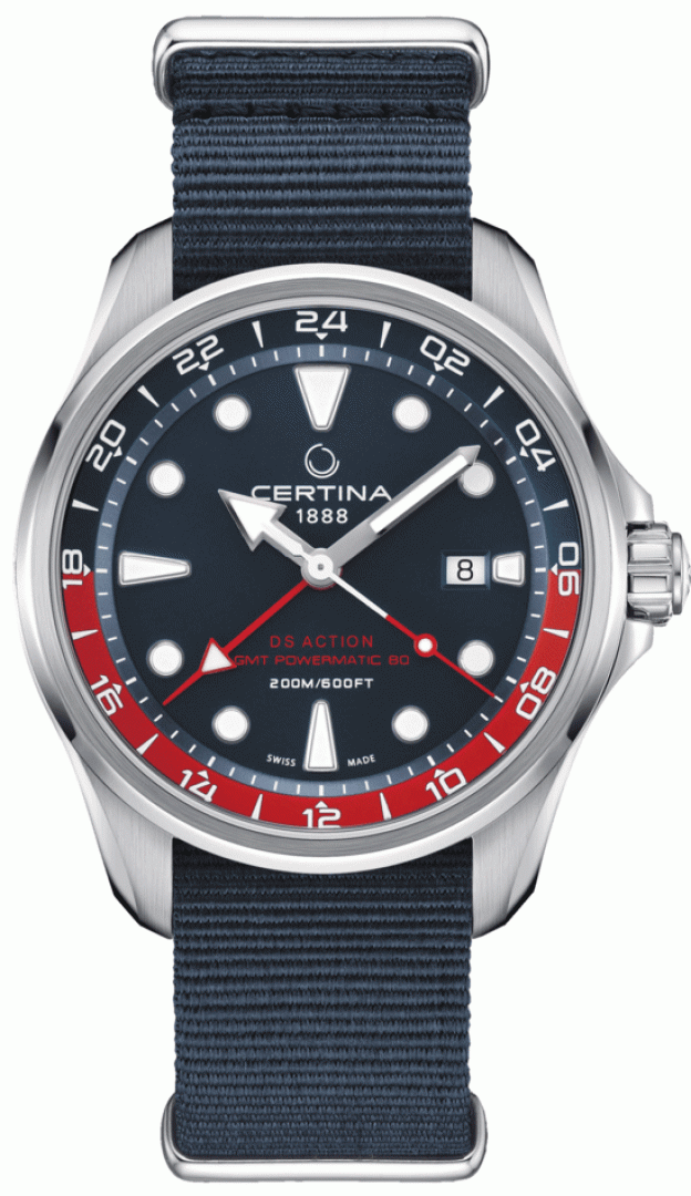 Luxusní hodinky Certina DS Action Powermatic 80, Vode odolnosť 200M, 43mm. Hodinky disponují funkcemi duální čas, luminiscence a ukazatel data. Základní parametry hodinek jsou: barva číselníku je černá, typ strojku je mechanické hodinky s automatickým nátahem, materiál řemínku je kůže a textil a vodotěsnost je 200 m.