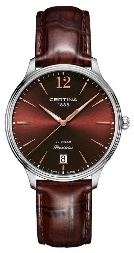 luxusní hodinky Certina DS Dream Precidrive, Quartz, 38 mm. Hodinky disponují funkcemi luminiscence, ukazatel data a E.O.L.. Základní parametry hodinek jsou: typ strojku je Quartz hodinky, vodotěsnost je 100 m, materiál řemínku je kůže a barva číselníku je hnědá.