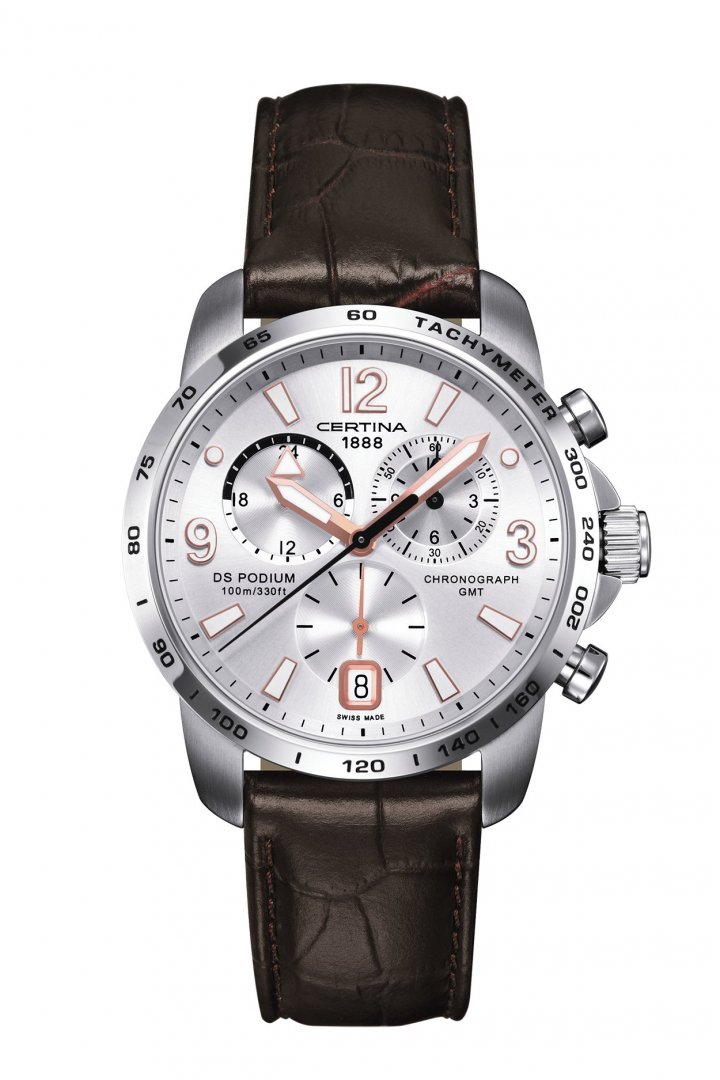 Sportovní hodinky Certina DS Podium GMT, Quartz Chronograf, 42 mm. Hodinky disponují funkcemi luminiscencia, ukazovateľ dátumu, stopky, tachymeter a duálny čas. Základní parametry hodinek jsou: vodotěsnost je 100 m, typ strojku je Quartz chronograf, barva číselníku je stříbrná a materiál řemínku je kůže.