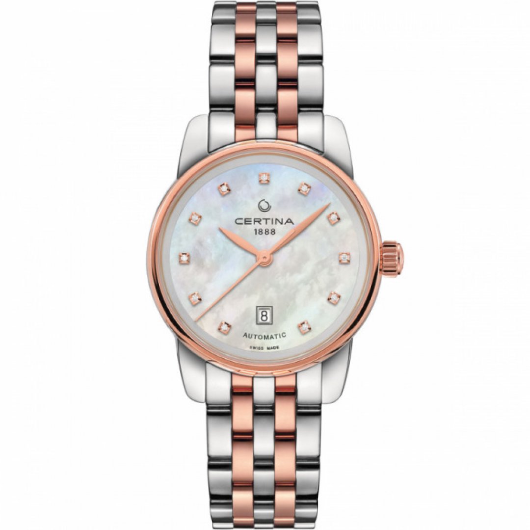 Luxusní hodinky Certina DS Podium Lady Diamanty, Automat, 29 mm. Hodinky disponují funkcemi ukazatel data. Základní parametry hodinek jsou: barva číselníku je perleť, typ strojku je mechanické hodinky s automatickým nátahem, materiál řemínku je ocel a vodotěsnost je 100 m.