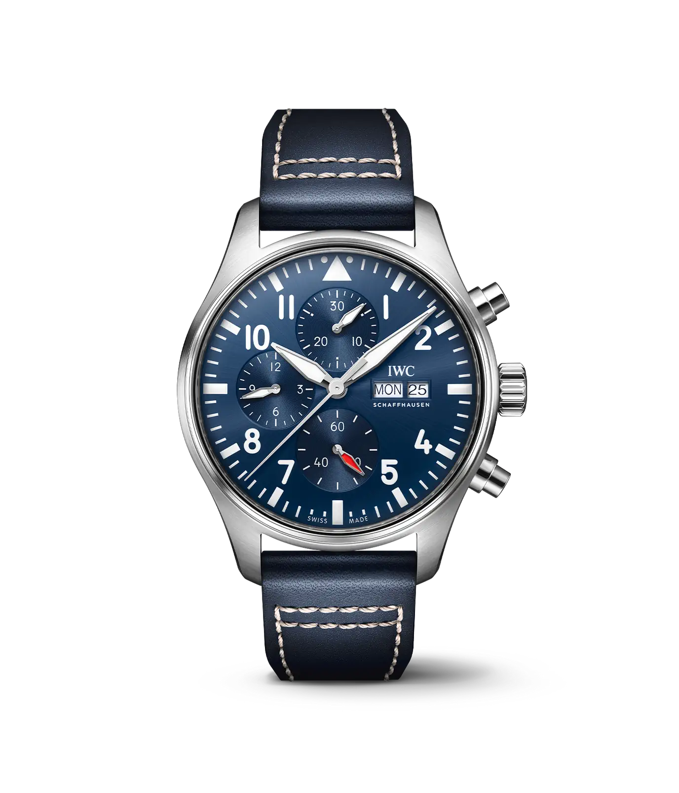 luxusní hodinky IWC Schaffhausen Pilot´s Watches PILOT'S WATCH CHRONOGRAPH Manufaktúrni kalibr, 43 mm. Hodinky disponují funkcemi luminiscence, stopky a ukazatel data. Základní parametry hodinek jsou: barva číselníku je modrá, typ strojku je mechanický chronograf s automatickým nátahem, materiál řemínku je kůže a vodotěsnost je 100 m.