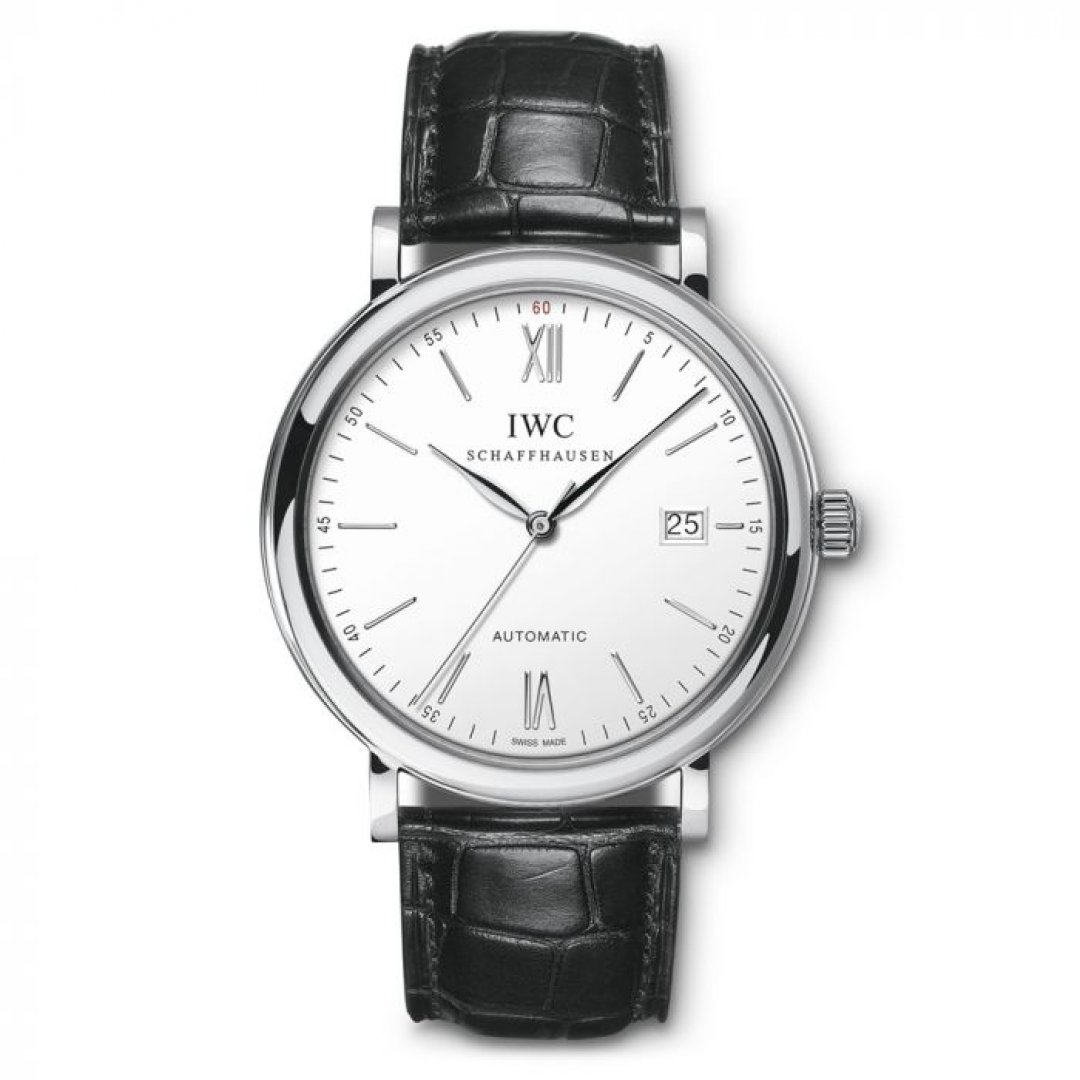 švýcarské hodinky IWC Portofino Automat, 40 mm. Hodinky disponují funkcemi ukazatel data. Základní parametry hodinek jsou: barva číselníku je stříbrná, typ strojku je mechanické hodinky s automatickým nátahem, materiál řemínku je kůže a vodotěsnost je 30 m.