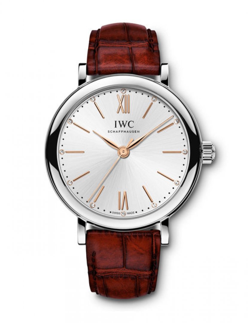 Luxusní hodinky IWC Portofino AUTOMATIC 34 Diamanty, 34 mm. Základní parametry hodinek jsou: barva číselníku je stříbrná, typ strojku je mechanické hodinky s automatickým nátahem, materiál řemínku je kůže a vodotěsnost je 30 m.