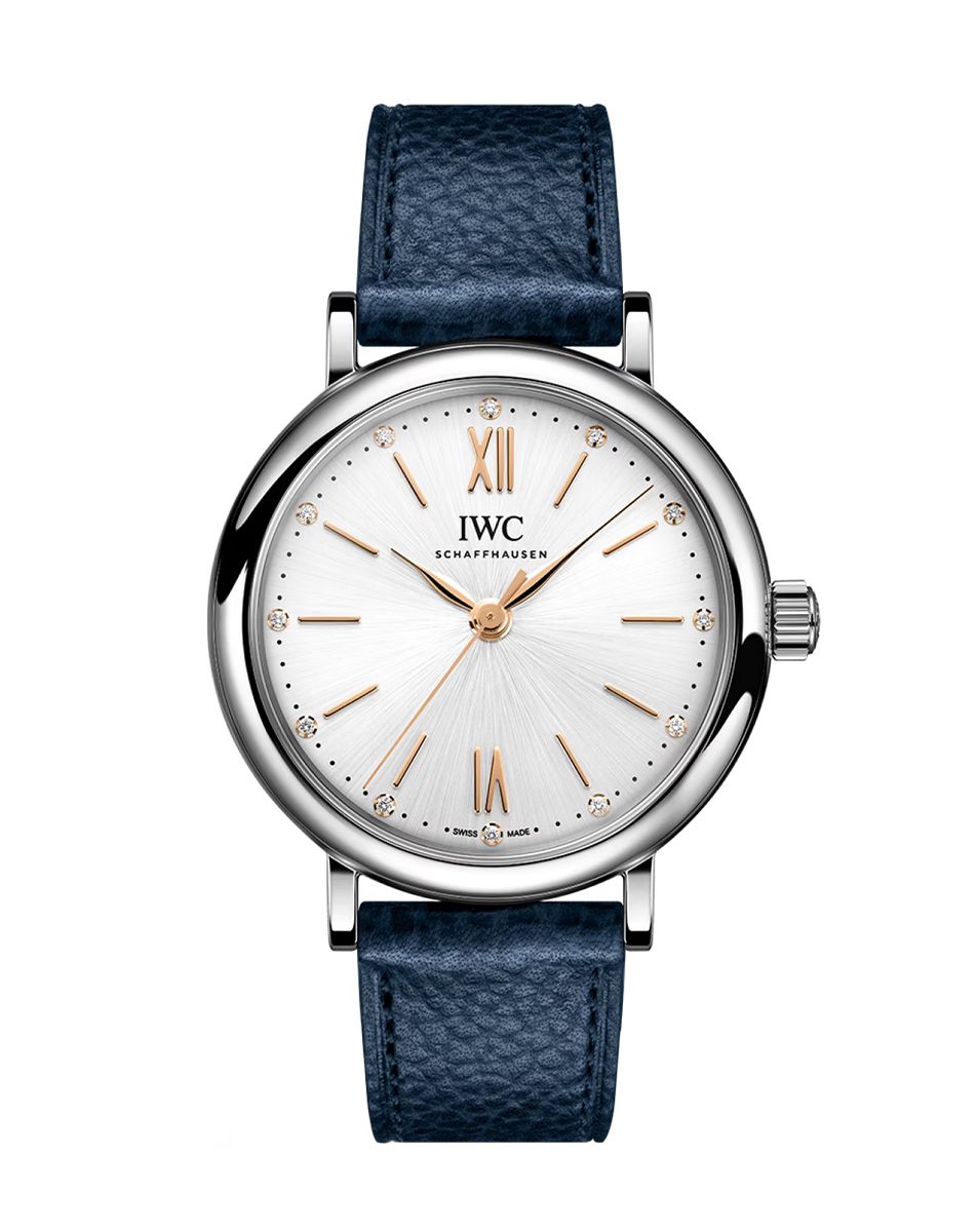 luxusní hodinky IWC Schaffhausen Portofino AUTOMATIC 34 Diamanty, 34 mm. Základní parametry hodinek jsou: typ strojku je mechanické hodinky s automatickým nátahem, materiál řemínku je kůže, vodotěsnost je 30 m a barva číselníku je stříbrná.