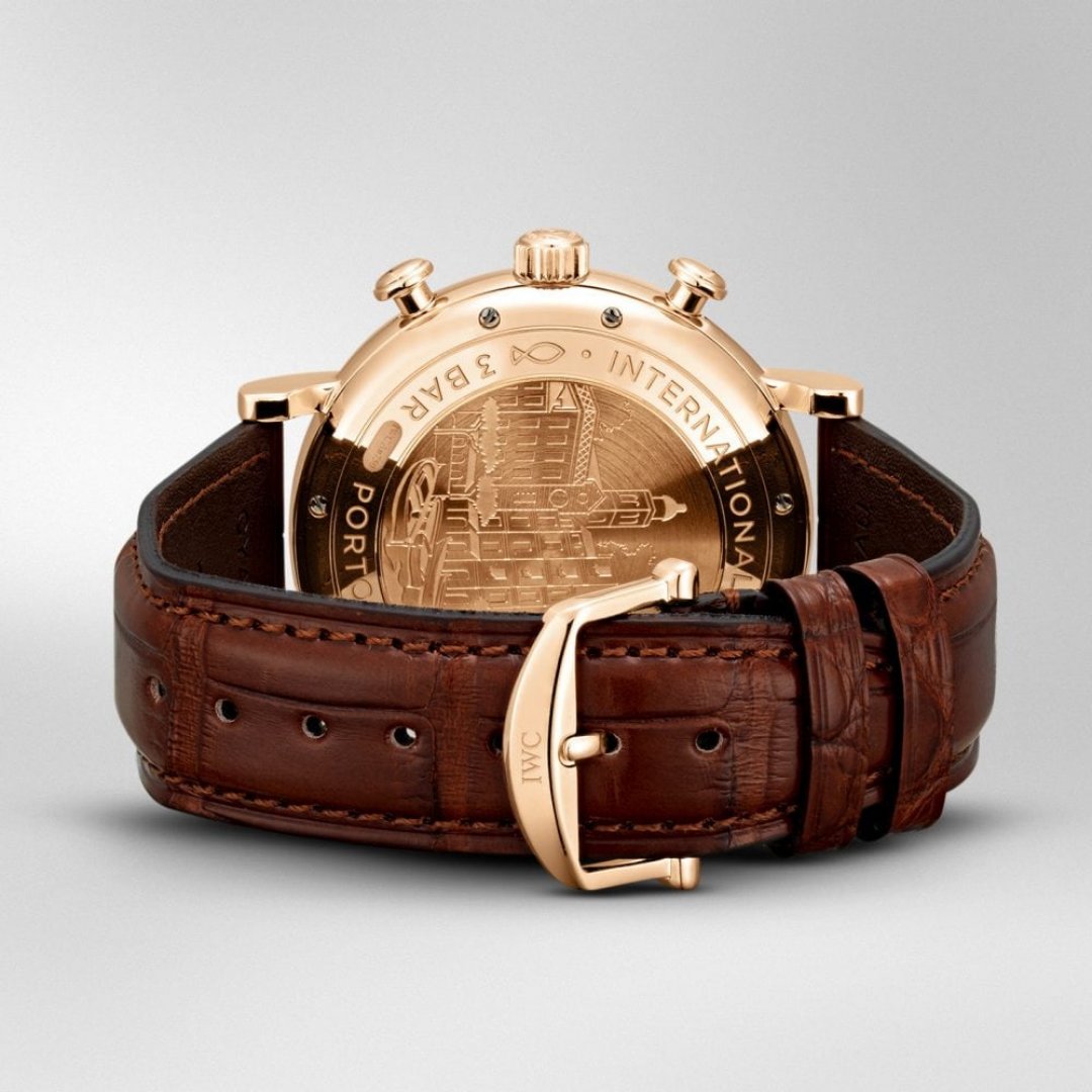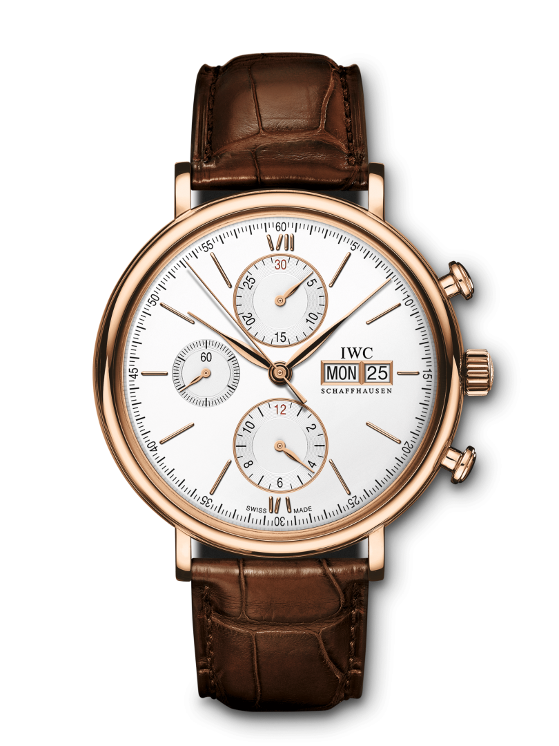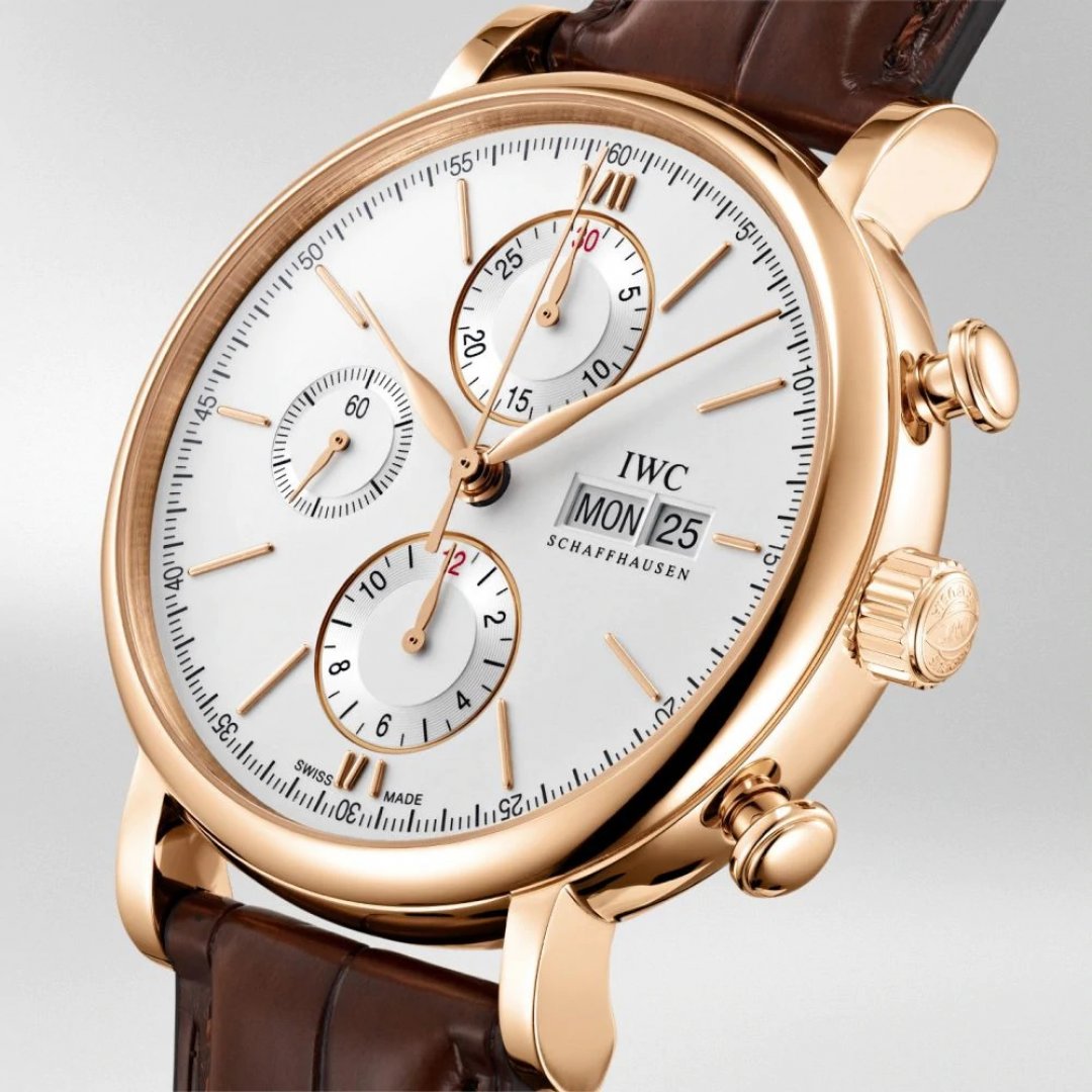Luxusní hodinky IWC Portofino CHRONOGRAPH Zlaté pouzdro, 42 mm. Hodinky disponují funkcemi stopky, ukazatel data a Day-Date. Základní parametry hodinek jsou: barva číselníku je stříbrná, typ strojku je mechanický chronograf s automatickým nátahem, materiál řemínku je kůže a vodotěsnost je 30 m.