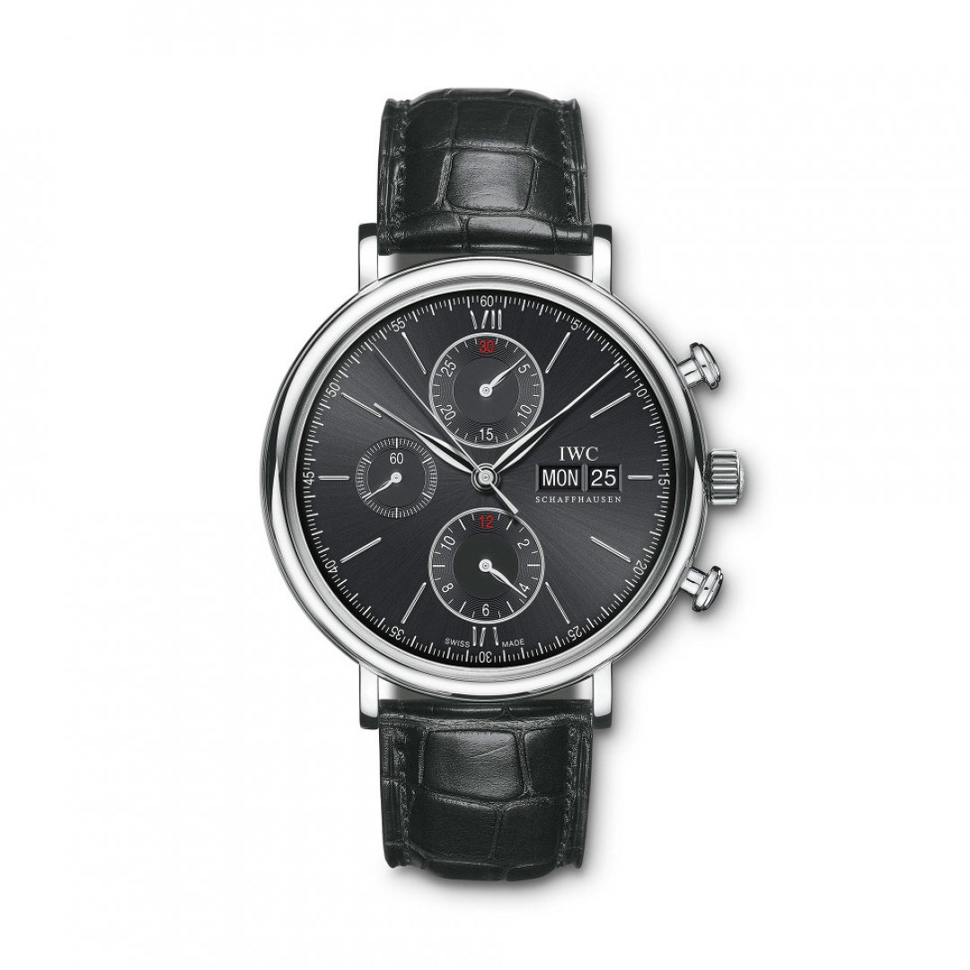 Luxusní hodinky IWC Portofino CHRONOGRAPH 42 mm. Hodinky disponují funkcemi stopky, ukazatel data a Day-Date. Základní parametry hodinek jsou: typ strojku je mechanický chronograf s automatickým nátahem, materiál řemínku je kůže, vodotěsnost je 30 m a barva číselníku je černá.