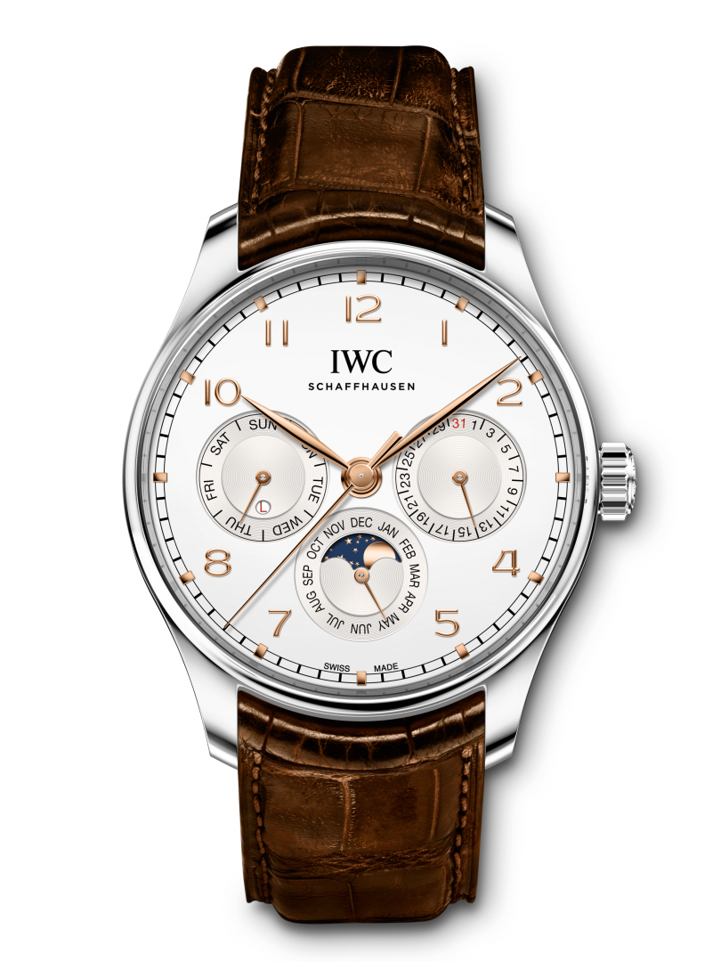 luxusní hodinky IWC Portugieser Manufaktúrni kalibr, Perpetual kalendář, 42 mm. Hodinky disponují funkcemi kalendář, měsíční fáze, ukazatel data a věčný klendář. Základní parametry hodinek jsou: barva číselníku je stříbrná, typ strojku je mechanické hodinky s automatickým nátahem, materiál řemínku je kůže a vodotěsnost je 30 m.