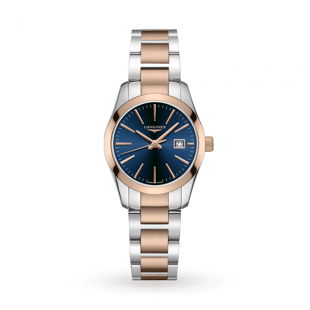 luxusní hodinky Longines Conquest Classic Quartz, 29.50 mm. Hodinky disponují funkcemi ukazatel data a E.O.L.. Základní parametry hodinek jsou: barva číselníku je modrá, typ strojku je Quartz hodinky, materiál řemínku je ocel a vodotěsnost je 50 m.