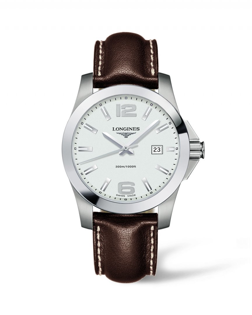 Luxusní hodinky Longines Conquest XL Řemínek, Quartz, 41 mm. Hodinky disponují funkcemi ukazovateľ dátumu, luminiscencia a E.O.L.. Základní parametry hodinek jsou: vodotěsnost je 300 m, barva číselníku je béžová, typ strojku je Quartz hodinky a materiál řemínku je kůže.