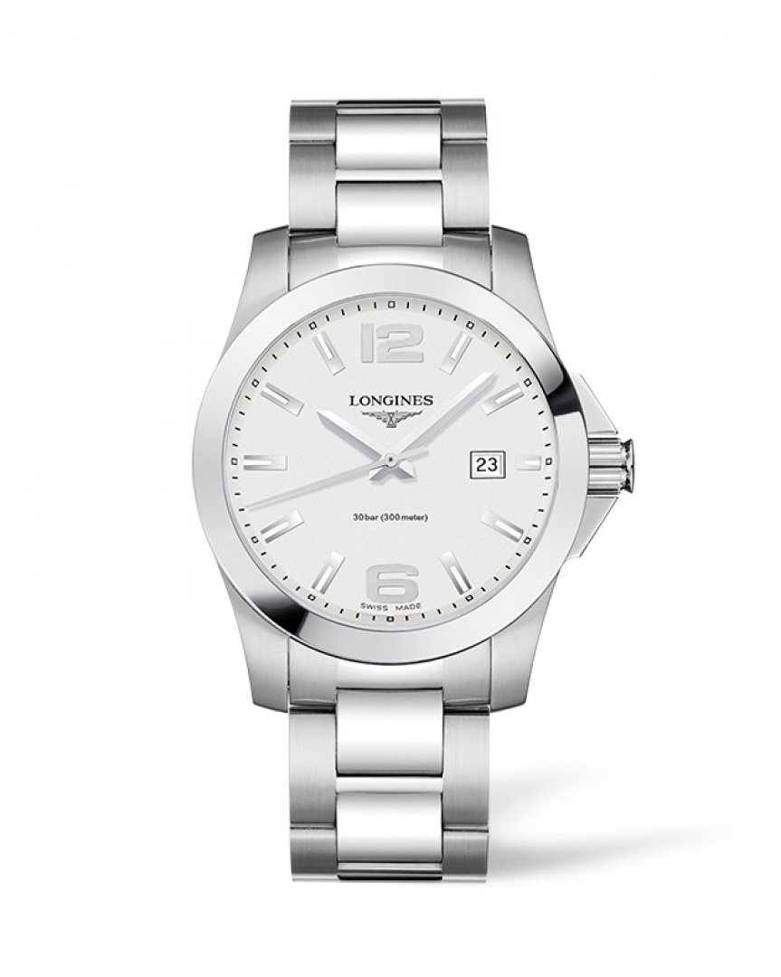 Luxusní hodinky Longines Conquest Vode odolnosť 300M, Quartz, 41mm. Hodinky disponují funkcemi ukazatel data, luminiscence a E.O.L.. Základní parametry hodinek jsou: materiál řemínku je ocel, vodotěsnost je 300 m, typ strojku je Quartz hodinky a barva číselníku je stříbrná.
