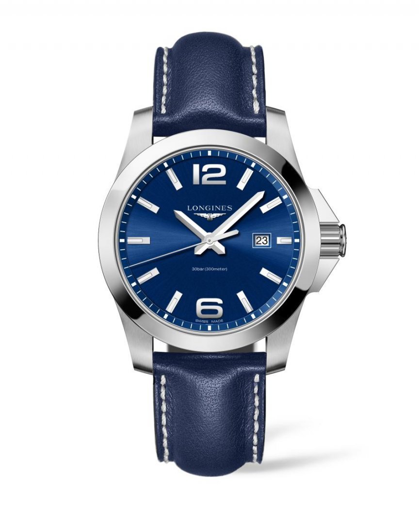 luxusní hodinky Longines Conquest Vodotěsnost 300M, Quartz, 43 mm. Hodinky disponují funkcemi ukazatel data, luminiscence a E.O.L.. Základní parametry hodinek jsou: vodotěsnost je 300 m, typ strojku je Quartz hodinky, barva číselníku je modrá a materiál řemínku je kůže.
