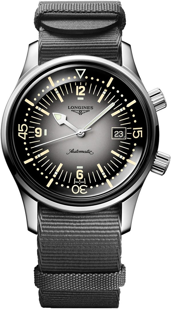 luxusní hodinky Longines Heritage Legend Diver Automat, Voděodolnost 300M, 42 mm. Hodinky disponují funkcemi luminiscence a ukazatel data. Základní parametry hodinek jsou: barva číselníku je černá a šedá, typ strojku je mechanické hodinky s automatickým nátahem, vodotěsnost je 300 m a materiál řemínku je textil.