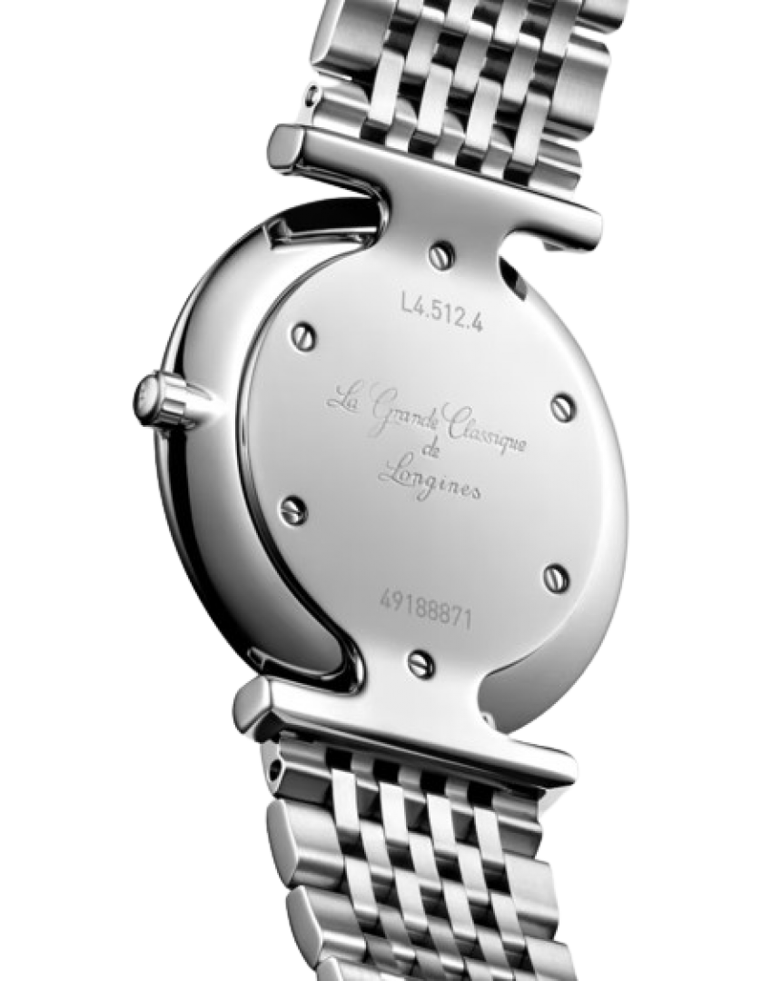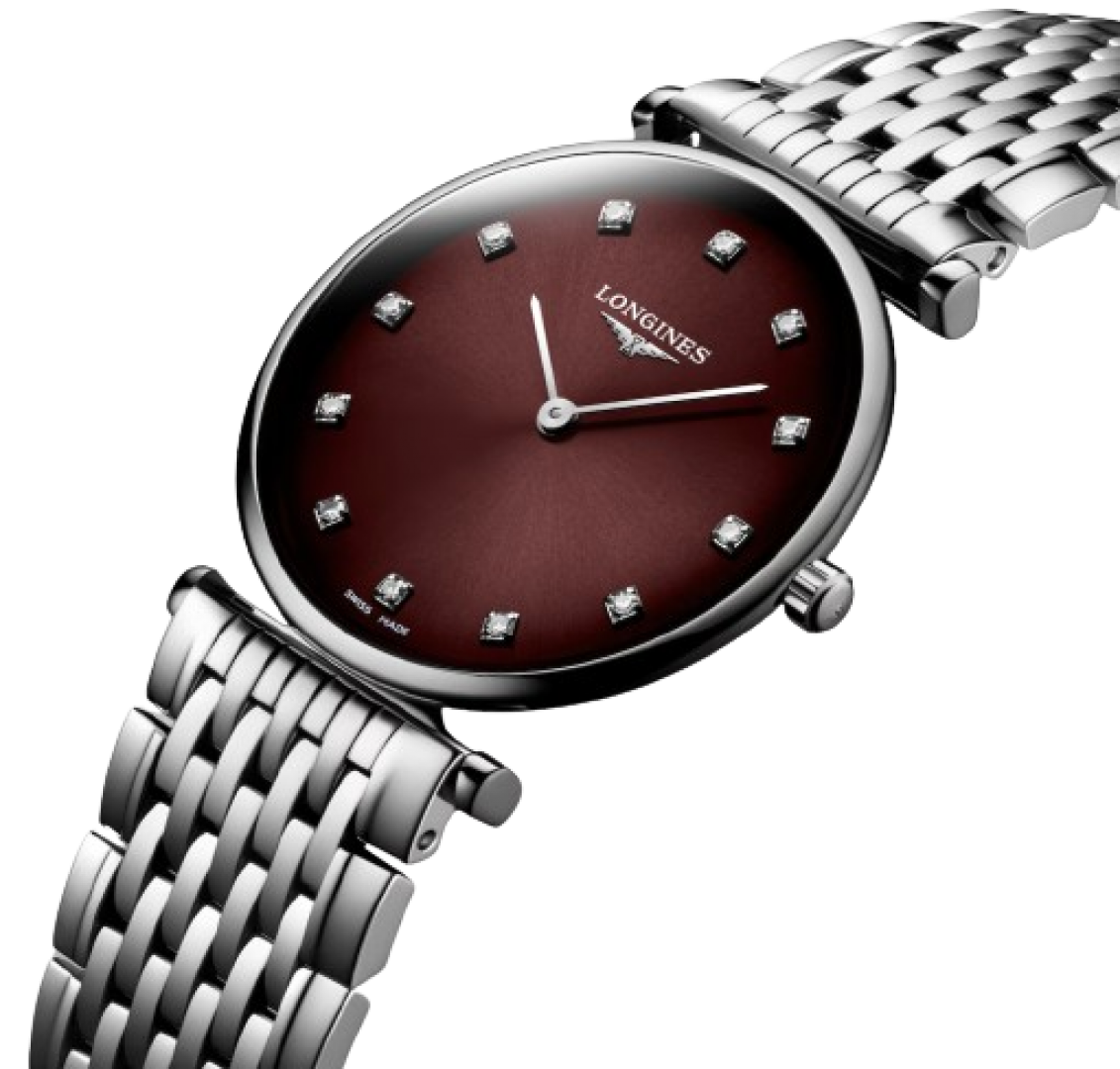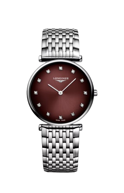 luxusní hodinky Longines La Grande Classique de Longines Diamanty, Quartz, 29 mm. Základní parametry hodinek jsou: typ strojku je Quartz hodinky, materiál řemínku je ocel, vodotěsnost je 30 m a barva číselníku je červená.
