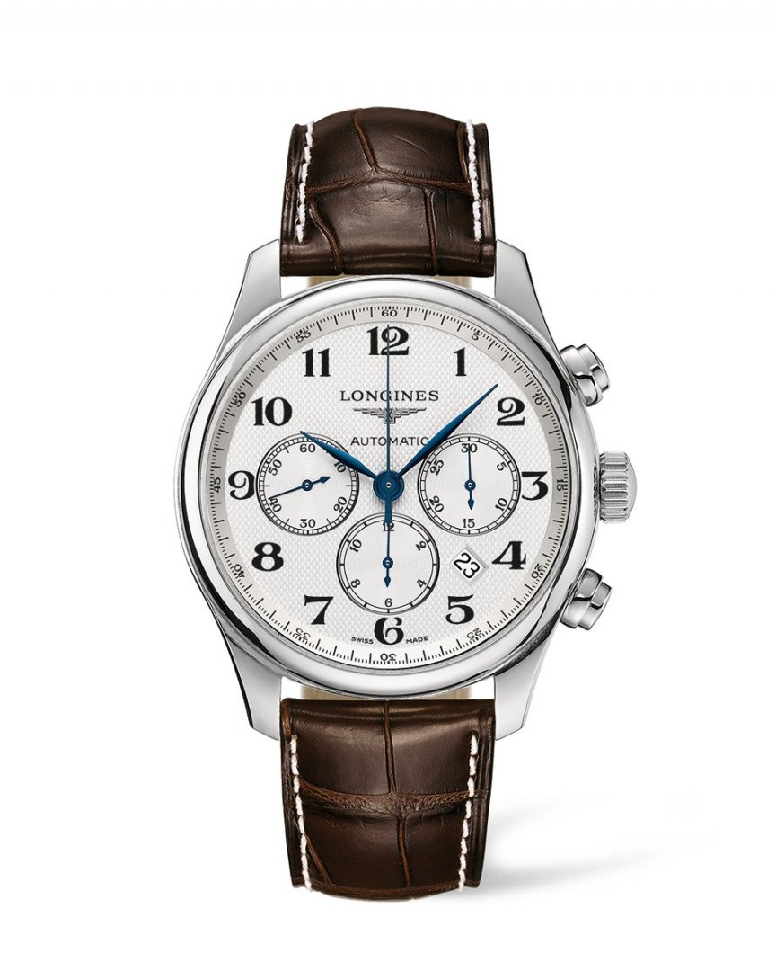Luxusní hodinky Longines Master Collection Column-Wheel, Automat Chronograf, 44 mm. Hodinky disponují funkcemi ukazovateľ dátumu a stopky. Základní parametry hodinek jsou: vodotěsnost je 30 m, barva číselníku je béžová, typ strojku je mechanický chronograf s automatickým nátahem a materiál řemínku je kůže.
