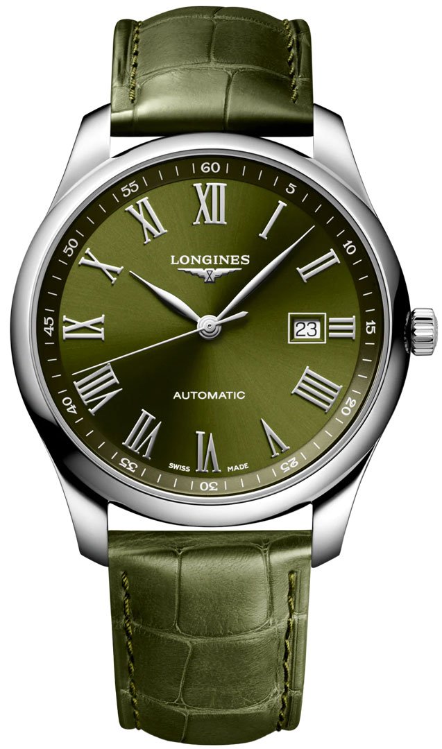 luxusní hodinky Longines Master Collection Automat, 42 mm. Hodinky disponují funkcemi ukazatel data. Základní parametry hodinek jsou: typ strojku je mechanické hodinky s automatickým nátahem, vodotěsnost je 50 m, materiál řemínku je kůže a barva číselníku je zelená.