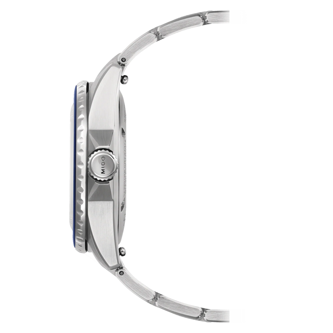 luxusní hodinky Mido Ocean Star Automat, Voděodolnost 200M, 36.50 mm. Hodinky disponují funkcemi luminiscence a ukazatel data. Základní parametry hodinek jsou: barva číselníku je modrá, typ strojku je mechanické hodinky s automatickým nátahem, materiál řemínku je ocel a vodotěsnost je 200 m.
