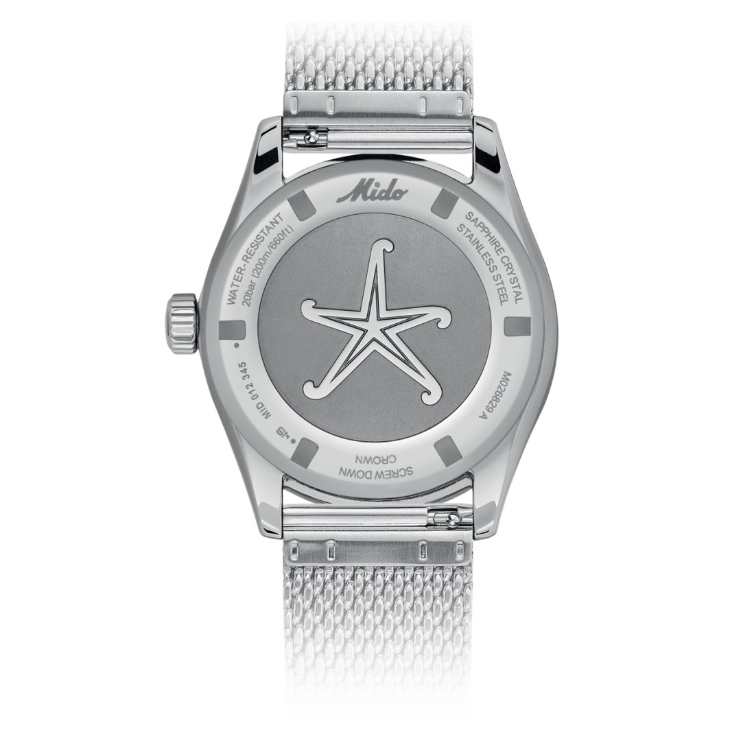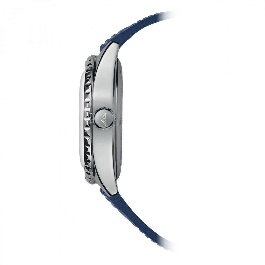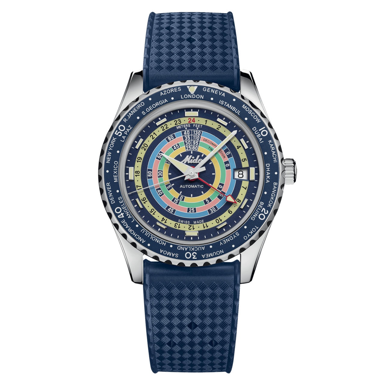 luxusní hodinky Mido Ocean Star TRIBUTE DECOPRESSION WORLDTIMER CALIBRE 80, GMT, Voděodolnost 200M, 40.50 mm. Hodinky disponují funkcemi duální čas a ukazatel data. Základní parametry hodinek jsou: typ strojku je mechanické hodinky s automatickým nátahem, vodotěsnost je 200 m, materiál řemínku je kaučuk a ocel a barva číselníku je modrá.