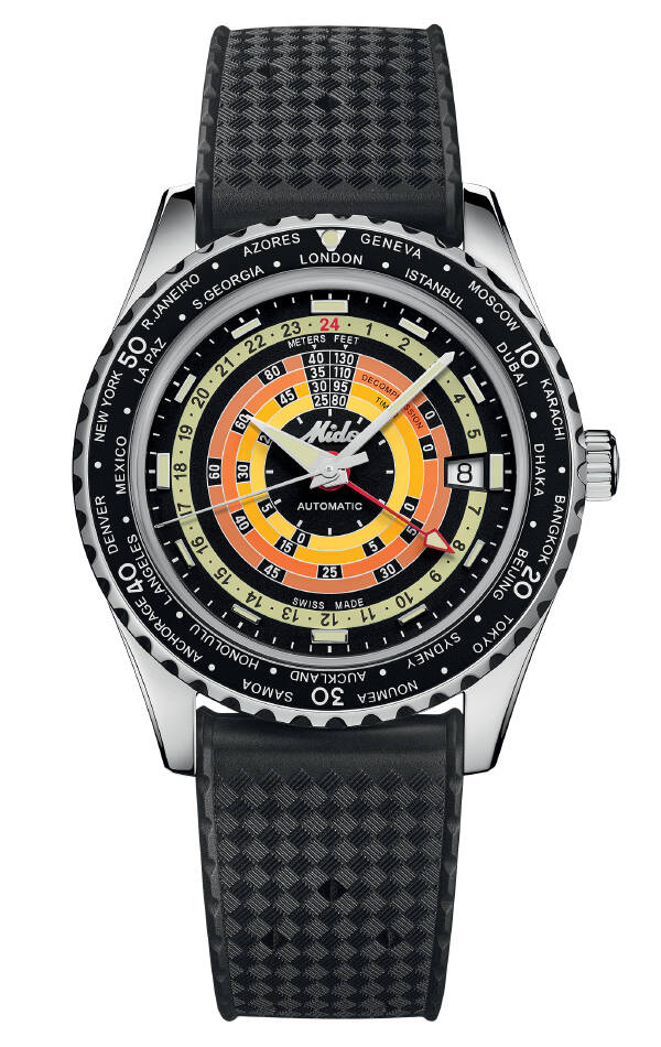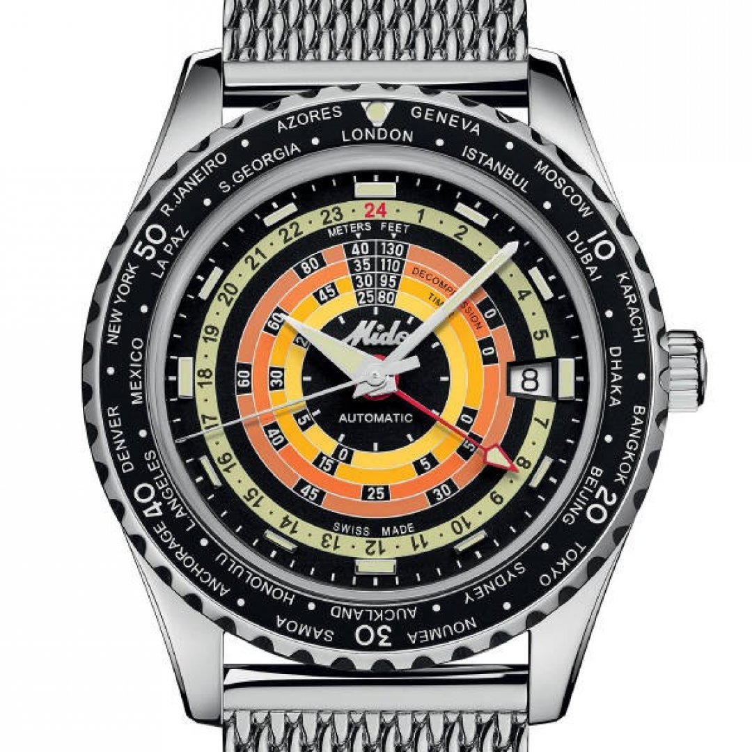 luxusní hodinky Mido Ocean Star TRIBUTE DECOPRESSION WORLDTIMER CALIBRE 80, GMT, Voděodolnost 200M, 40.50 mm. Hodinky disponují funkcemi Day-Date, duální čas a ukazatel data. Základní parametry hodinek jsou: typ strojku je mechanické hodinky s automatickým nátahem, vodotěsnost je 200 m, materiál řemínku je kaučuk a ocel a barva číselníku je černá.