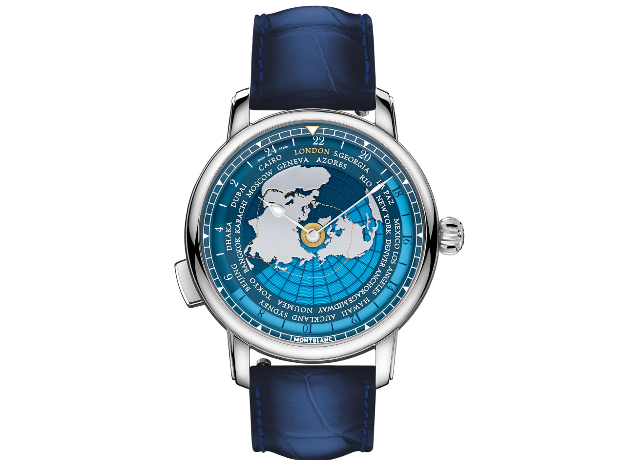 luxusní hodinky Montblanc Star Legacy ORBIS TERRARUM AROUND THE WORLD IN 80 DAYS LIMITED EDITION - 360 PIECES Automat, 43 mm, LE 360 ks. Hodinky disponují funkcemi světové časy. Základní parametry hodinek jsou: barva číselníku je stříbrná a modrá, typ strojku je mechanické hodinky s automatickým nátahem, materiál řemínku je kůže a vodotěsnost je 50 m.