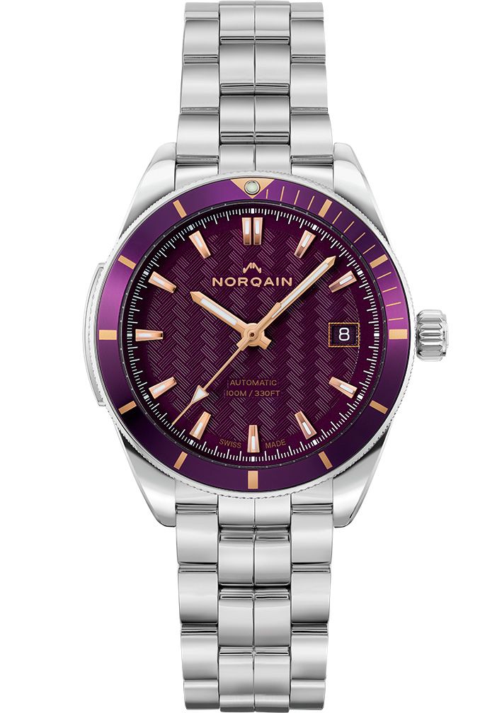 luxusní hodinky Norqain ADVENTURE SPORT 37MM Automat, Voděodolnost 100M. Hodinky disponují funkcemi luminiscence a ukazatel data. Základní parametry hodinek jsou: typ strojku je mechanické hodinky s automatickým nátahem, vodotěsnost je 100 m, barva číselníku je fialová a materiál řemínku je ocel.