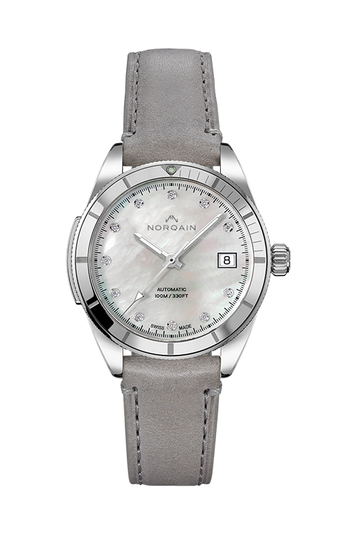 luxusní hodinky Norqain ADVENTURE SPORT 37MM Diamanty, Automat, Voděodolnost 100M. Hodinky disponují funkcemi luminiscence a ukazatel data. Základní parametry hodinek jsou: typ strojku je mechanické hodinky s automatickým nátahem, vodotěsnost je 100 m, materiál řemínku je kůže a barva číselníku je perleť.