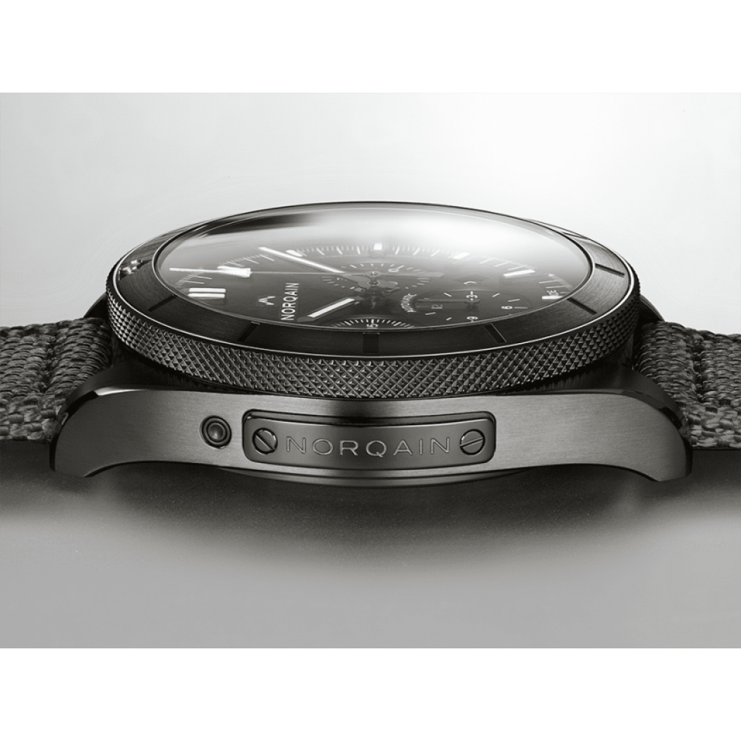 luxusní hodinky Norquain ADVENTURE SPORT CHRONO Automat Chronograf, Voděodolnost 100M, 44 mm. Hodinky disponují funkcemi luminiscence, stopky a ukazatel data. Základní parametry hodinek jsou: barva číselníku je černá, typ strojku je mechanický chronograf s automatickým nátahem, materiál řemínku je kaučuk a vodotěsnost je 100 m.