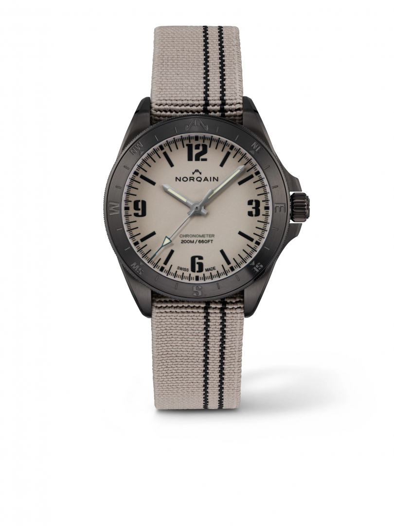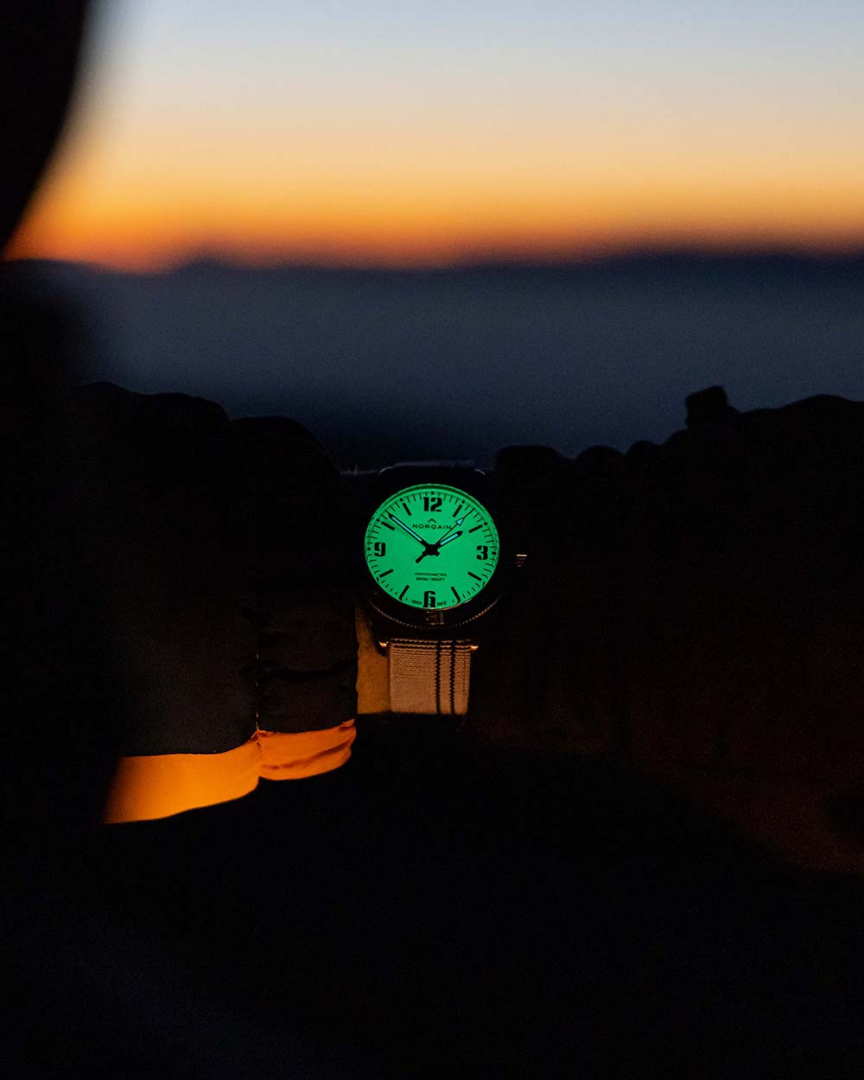 luxusní hodinky Norquain ADVENTURE NEVEREST NIGHT SIGHT Automat, Voděodolnost 100M, 40 mm. Hodinky disponují funkcemi luminiscence. Základní parametry hodinek jsou: barva číselníku je béžová, typ strojku je mechanické hodinky s automatickým nátahem, materiál řemínku je textil a vodotěsnost je 100 m.