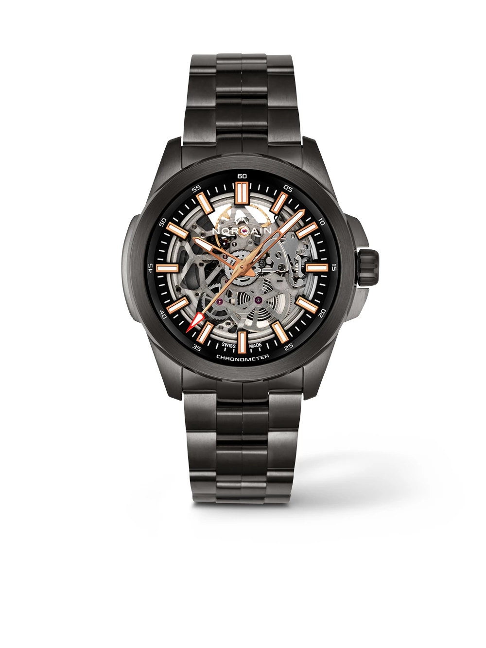 luxusní hodinky Norqain INDEPENDENCE SKELETON DLC Automat, 42 mm. Hodinky disponují funkcemi luminiscence. Základní parametry hodinek jsou: barva číselníku je průhledná, typ strojku je mechanické hodinky s automatickým nátahem, materiál řemínku je ocel a vodotěsnost je 100 m.