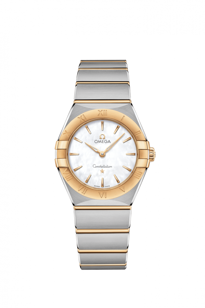 Luxusní hodinky Omega Constellation Manhattan Zlato, Quartz, 28mm. Základní parametry hodinek jsou: typ strojku je Quartz hodinky, materiál řemínku je ocel a zlato, vodotěsnost je 30 m a barva číselníku je perleť.