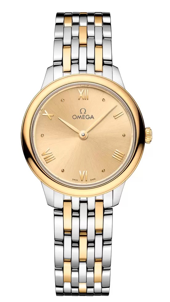 luxusní hodinky Omega De Ville Prestige Zlato, Quartz, 27.5 mm. Základní parametry hodinek jsou: typ strojku je Quartz hodinky, materiál řemínku je ocel a zlato, vodotěsnost je 30 m a barva číselníku je zlatá.