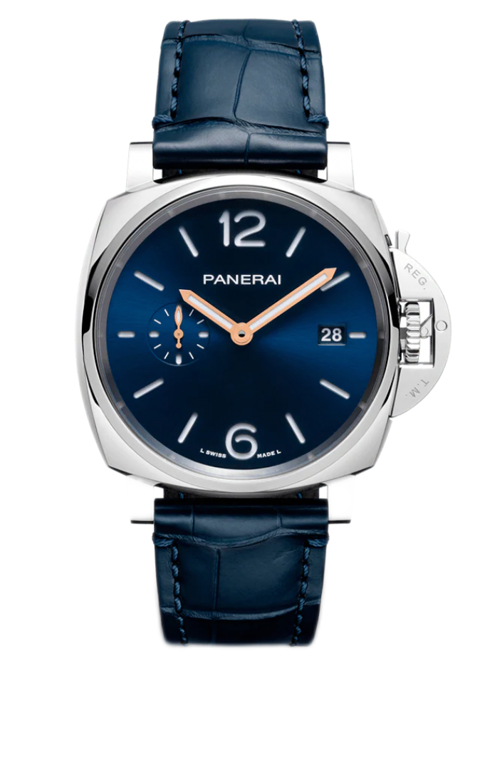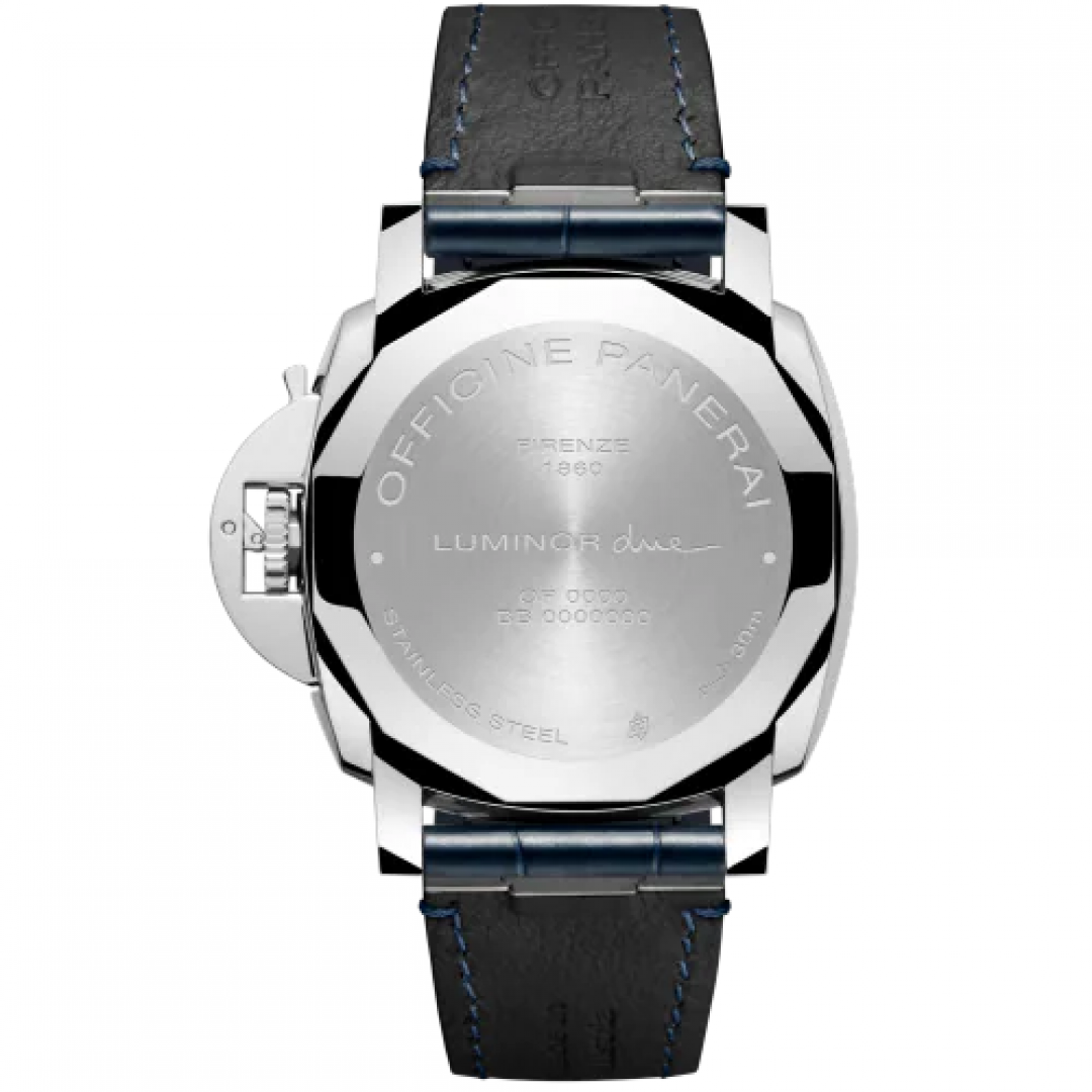 luxusní hodinky Panerai Luminor Due Manufakturní kalibr, 42 mm. Hodinky disponují funkcemi luminiscence a ukazatel data. Základní parametry hodinek jsou: typ strojku je mechanické hodinky s automatickým nátahem, materiál řemínku je kůže, vodotěsnost je 30 m a barva číselníku je modrá.