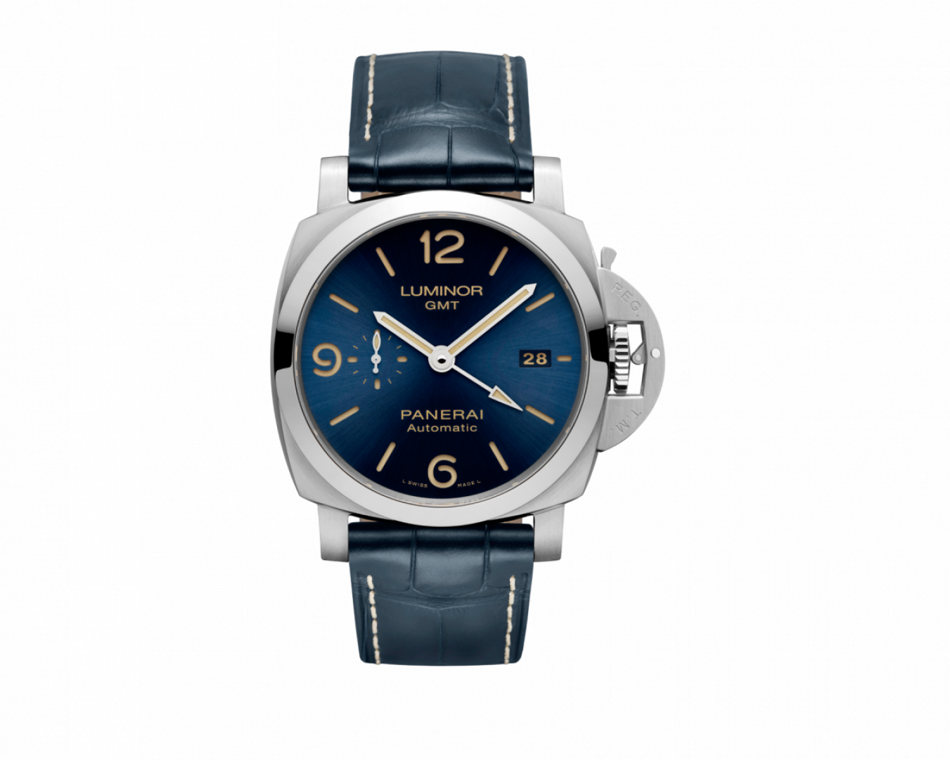 luxusní hodinky Panerai Luminor GMT Manufaktúrni kalibr, GMT, 44 mm. Hodinky disponují funkcemi duální čas, luminiscence a ukazatel data. Základní parametry hodinek jsou: barva číselníku je modrá, typ strojku je mechanické hodinky s automatickým nátahem, materiál řemínku je kůže a vodotěsnost je 300 m.