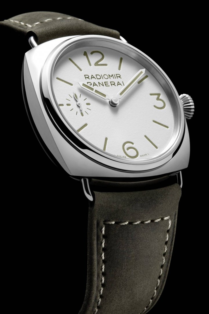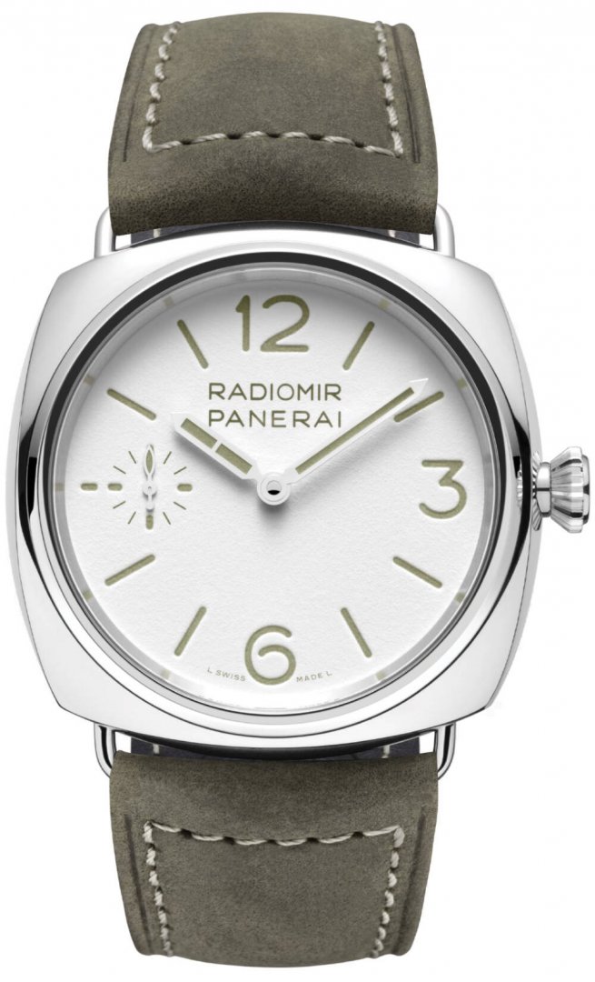 luxusní hodinky Panerai Radiomir Officine Manufaktúrni kalibr, 45 mm. Hodinky disponují funkcemi luminiscence. Základní parametry hodinek jsou: typ strojku je mechanické hodinky s ručním nátahem, materiál řemínku je kůže, vodotěsnost je 100 m a barva číselníku je bílá.