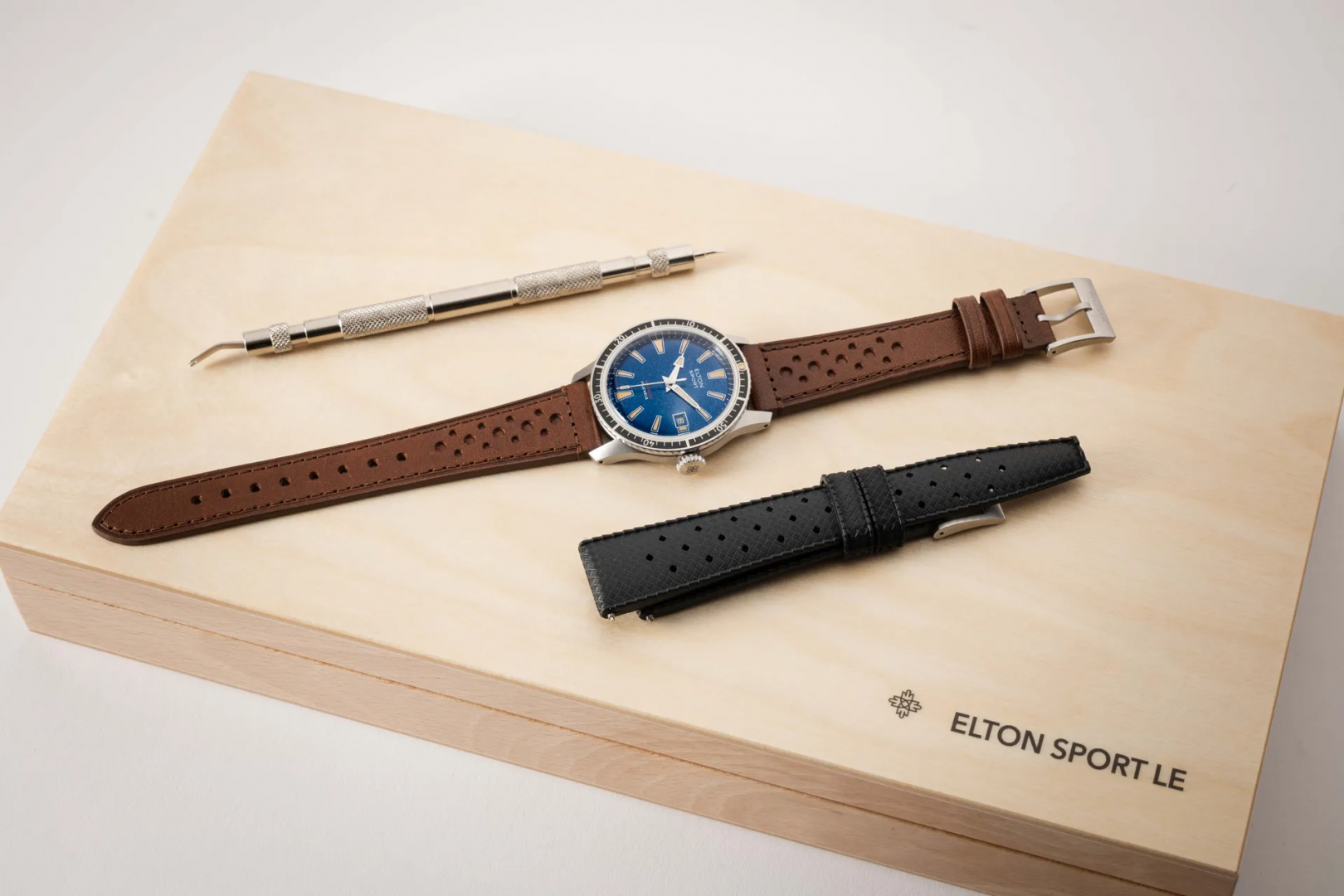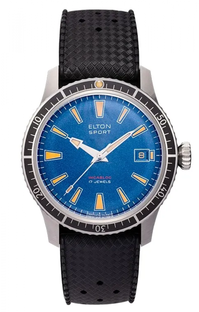 Luxusní hodinky Elton Sport Manufaktúrni kalibr, 38 mm. Hodinky disponují funkcemi luminiscence a ukazatel data. Základní parametry hodinek jsou: barva číselníku je modrá, typ strojku je mechanické hodinky s ručním nátahem, materiál řemínku je kaučuk a kůže a vodotěsnost je 100 m.