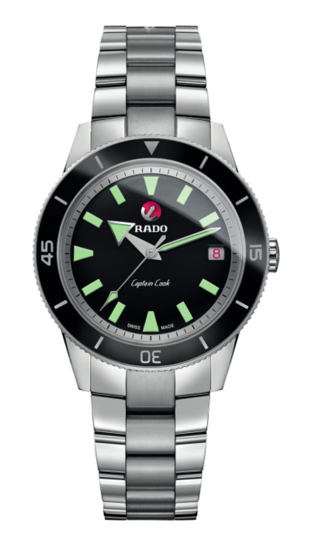 luxusní hodinky Rado Captain Cook Automatic Automat, 37,3mm, 100m vodeodolnost. Hodinky disponují funkcemi luminiscence a ukazatel data. Základní parametry hodinek jsou: barva číselníku je černá, typ strojku je mechanické hodinky s automatickým nátahem, materiál řemínku je ocel a vodotěsnost je 100 m.