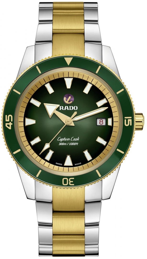 luxusní hodinky Rado Captain Cook Automatic Voděodolnost 300M, 42 mm. Hodinky disponují funkcemi luminiscence a ukazatel data. Základní parametry hodinek jsou: typ strojku je mechanické hodinky s automatickým nátahem, vodotěsnost je 300 m, materiál řemínku je ocel a titan a barva číselníku je zelená.