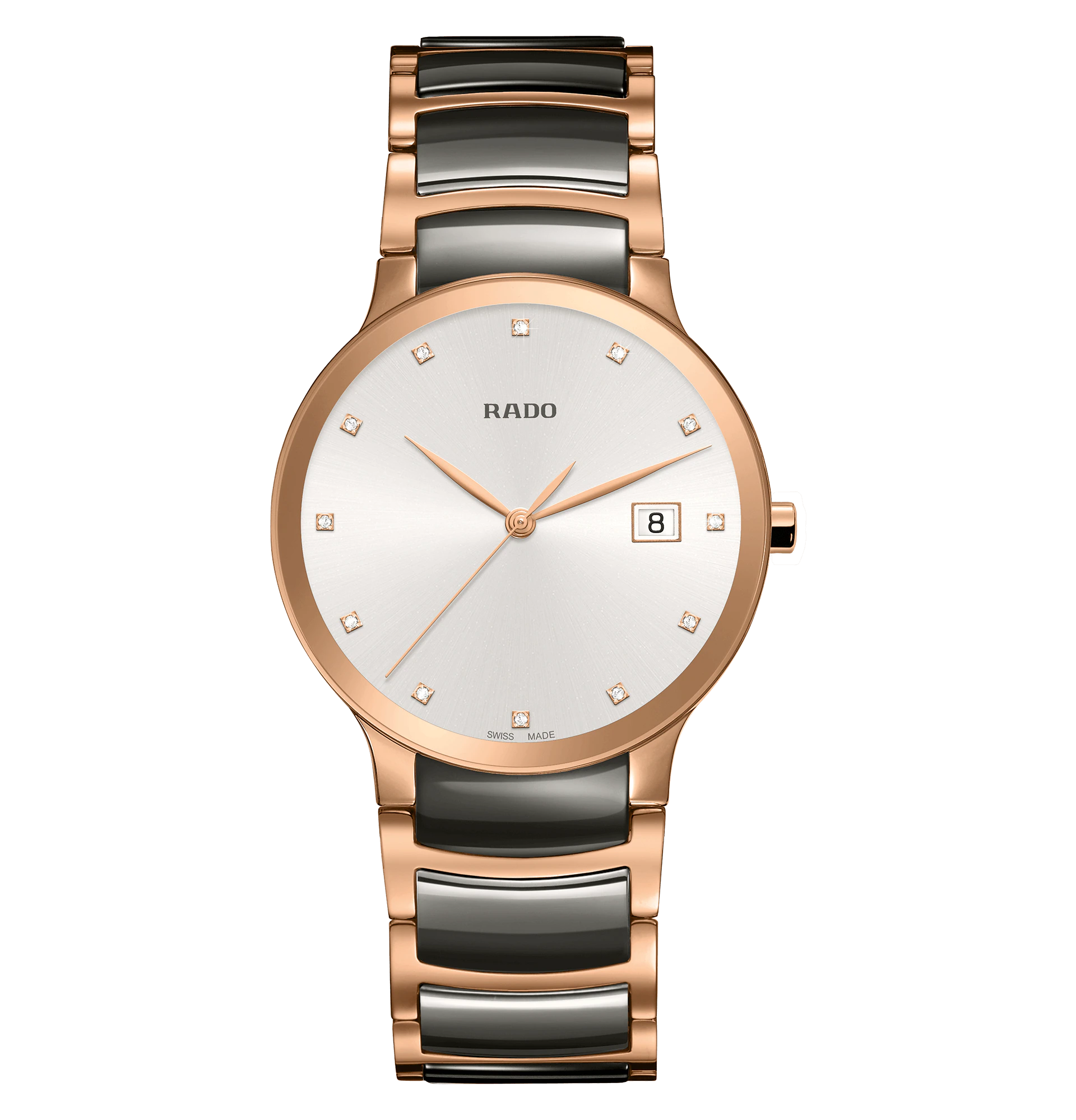 luxusní hodinky Rado Centrix Diamanty. Quartz, 38 mm. Hodinky disponují funkcemi ukazatel data. Základní parametry hodinek jsou: materiál řemínku je ocel a keramika, vodotěsnost je 30 m, typ strojku je Quartz hodinky a barva číselníku je stříbrná.